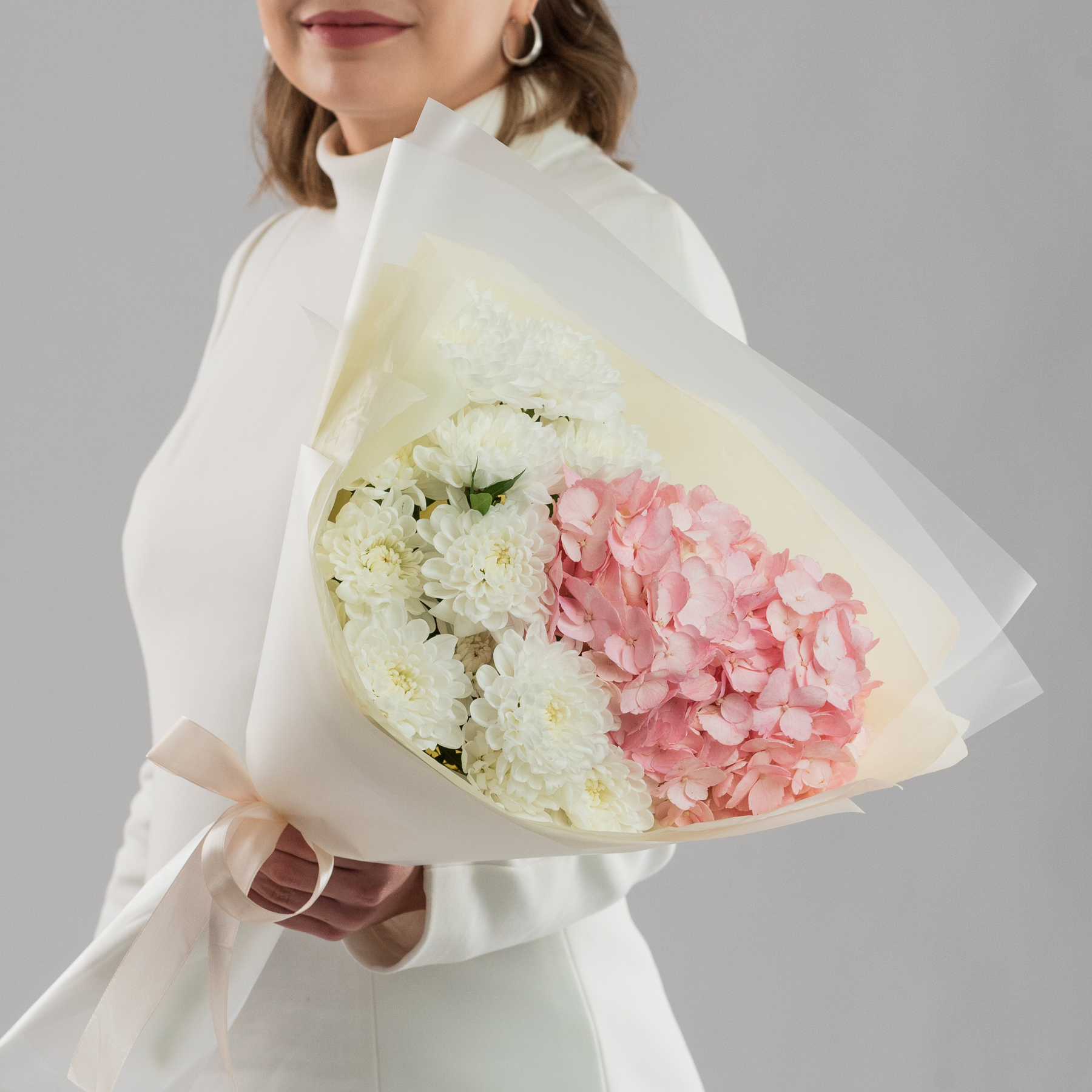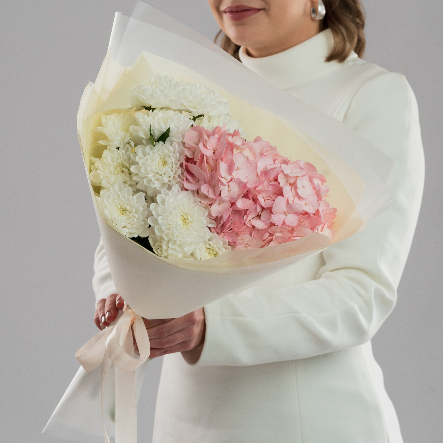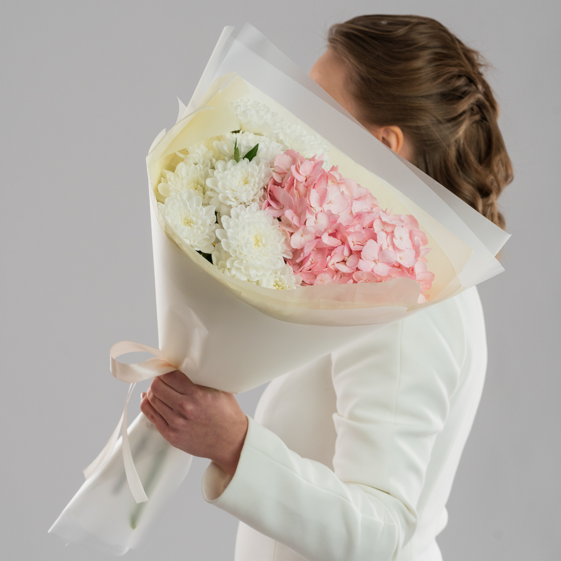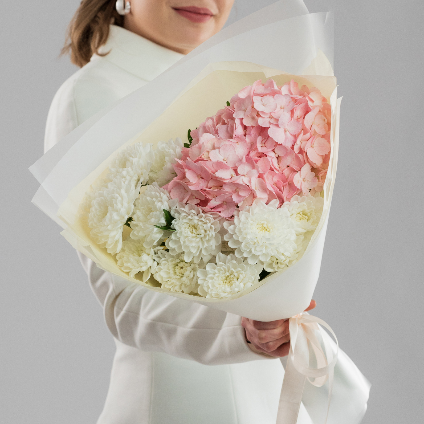 Воздушная композиция в пастельных тонах. Она выражает трогательную нежность, искреннее восхищение и заботу. Такой букет создает атмосферу светлой романтики, тепла и волшебства, напоминая о самых радостных моментах ваших отношений.