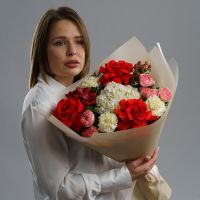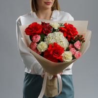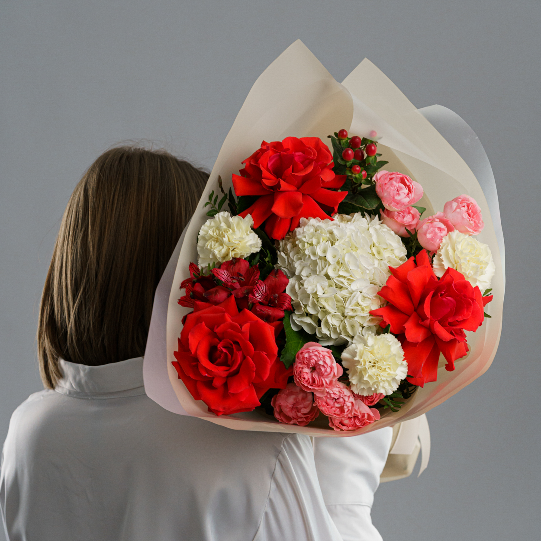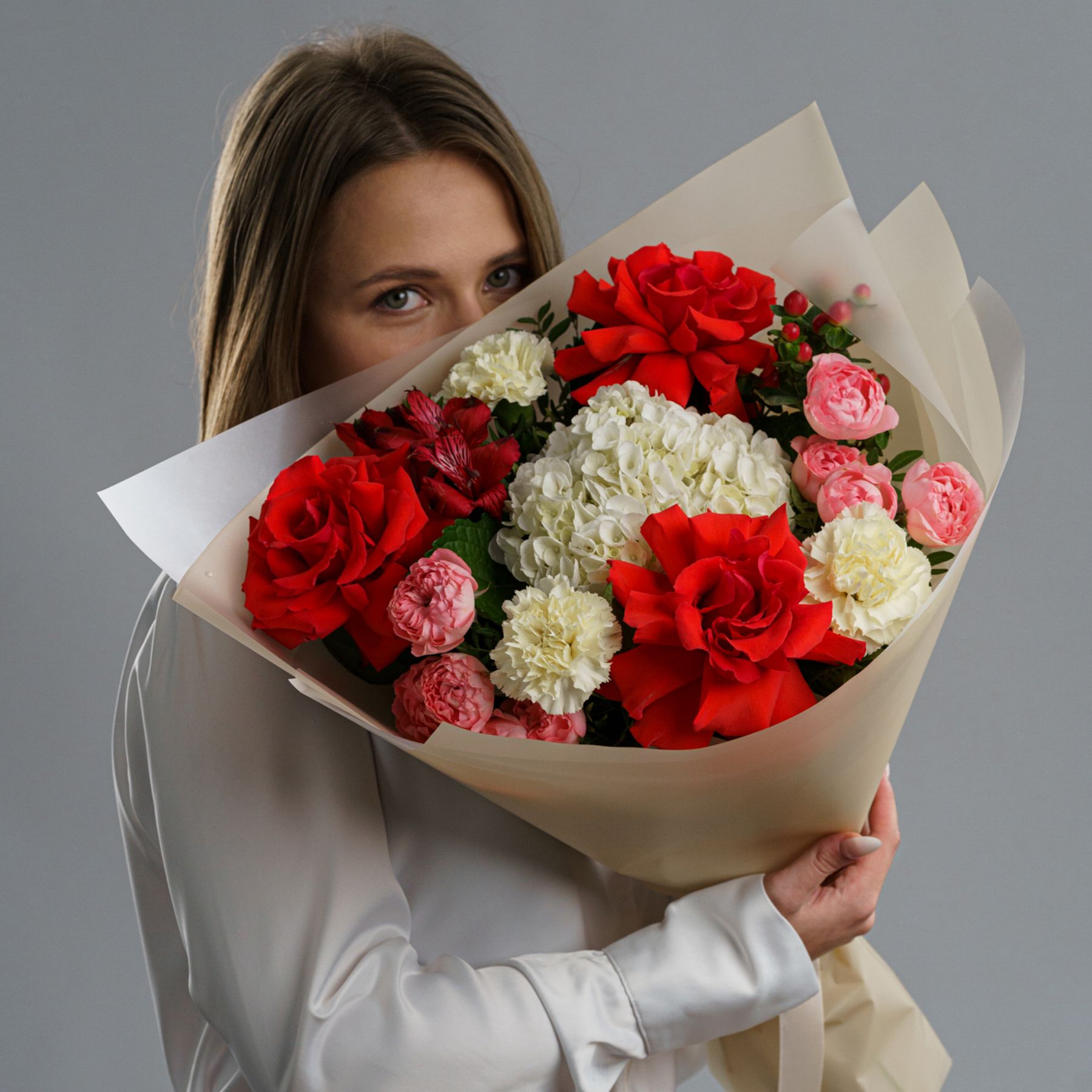 Выразительная классика: алые розы и ягоды гиперикума в дуэте с белой гортензией и гвоздиками, акцент — розовая кустовая роза. Подойдёт для признания, юбилея, благодарности. Можно купить цветы онлайн: доставка на дом по городу, бесплатная доставка. Свежесть гарантируем, упаковка — премиальная.