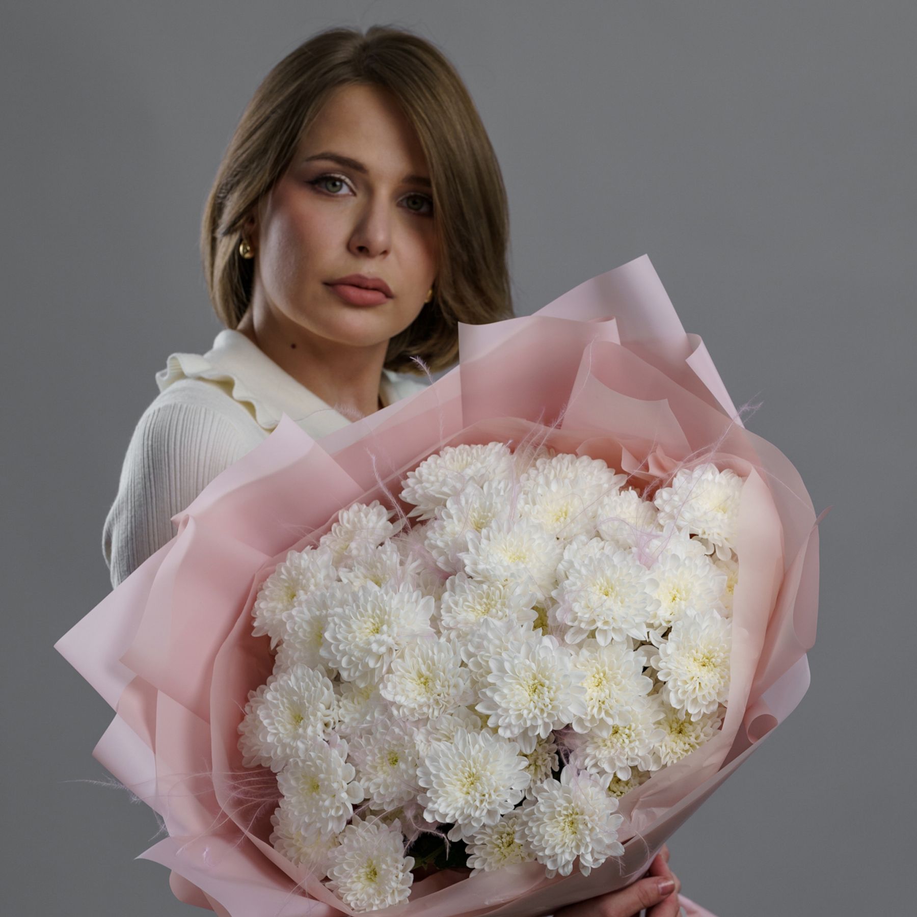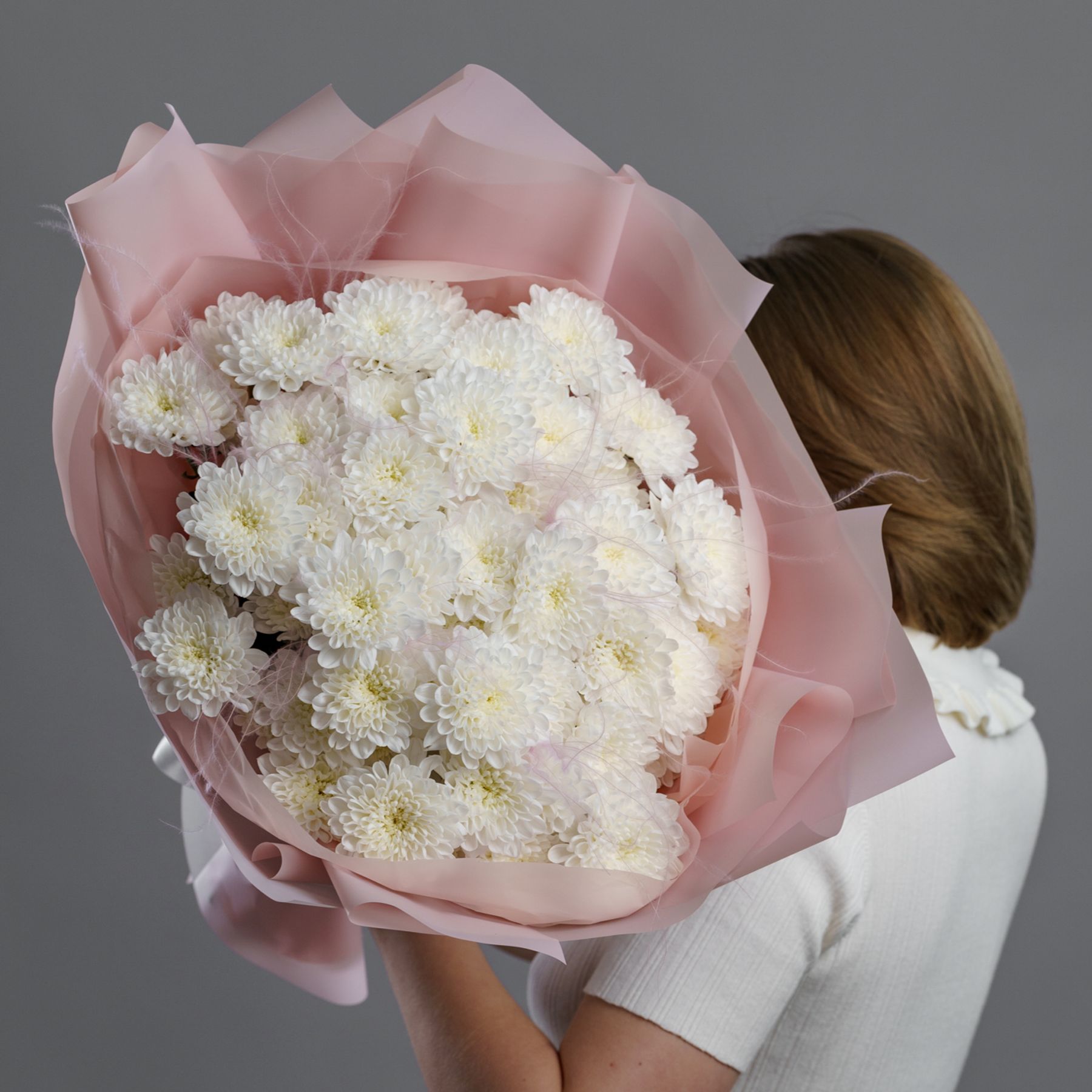 Идеальное сочетание чистоты и трепетной нежности. Белоснежные соцветия хризантем, символизирующие искренность и совершенство, обрамленные в нежную розовую упаковку. Этот контраст создает утонченную гармонию, где строгая элегантность встречается с мягкой романтикой.