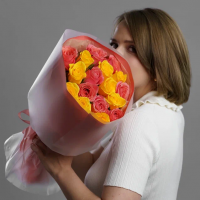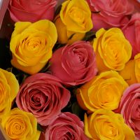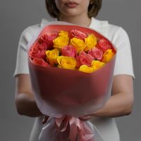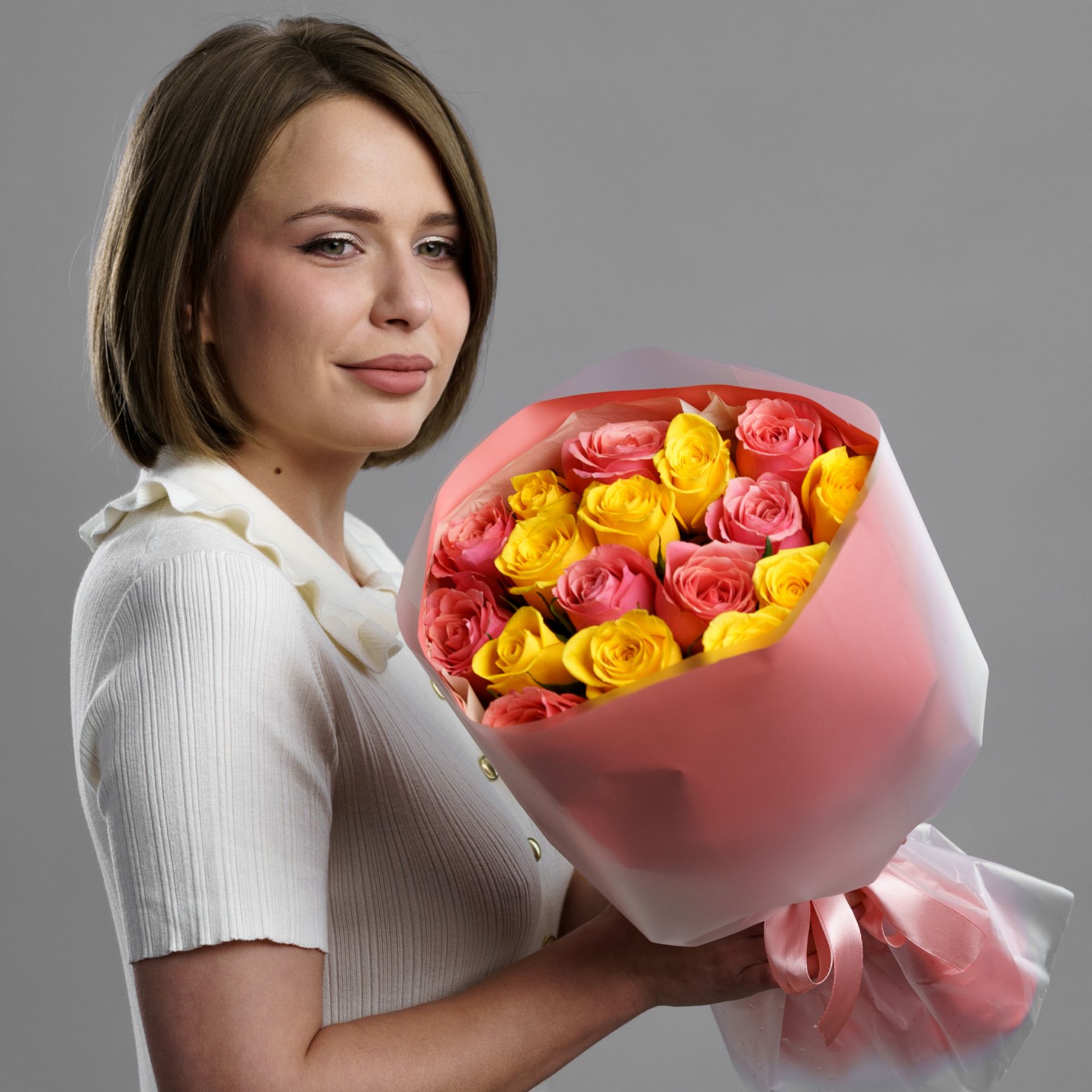 Мягкое перетекание солнечного желтого в нежный коралловый — каждая роза в этом букете словно освещена теплым закатным светом. Пышные бархатистые бутоны с тонким свежим ароматом создают ощущение летней гармонии и радости. Их необычный двуцветный окрас и изысканная форма превращают композицию в настоящий флористический шедевр.