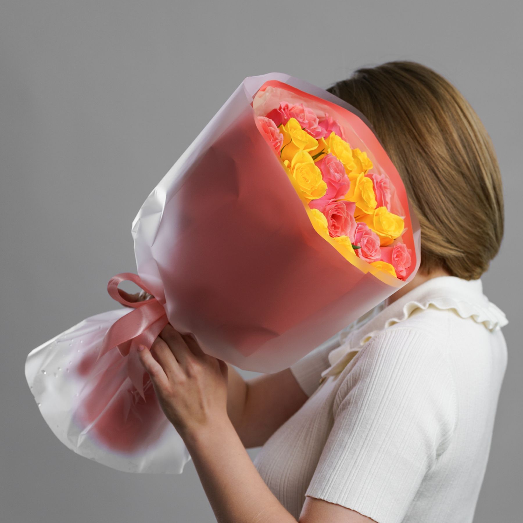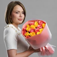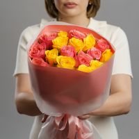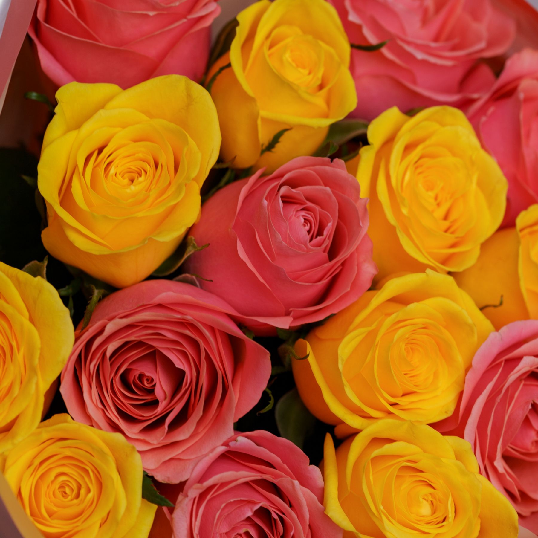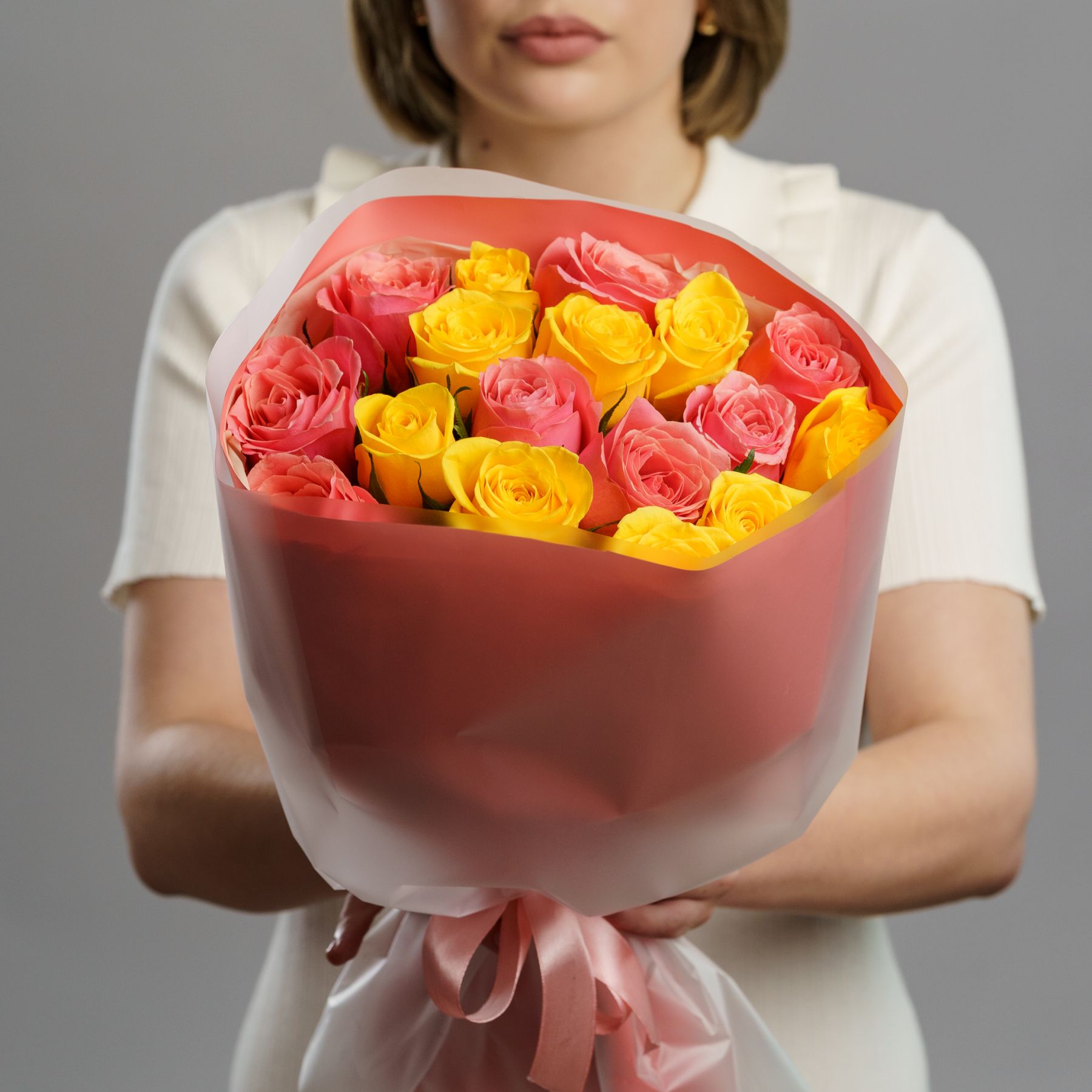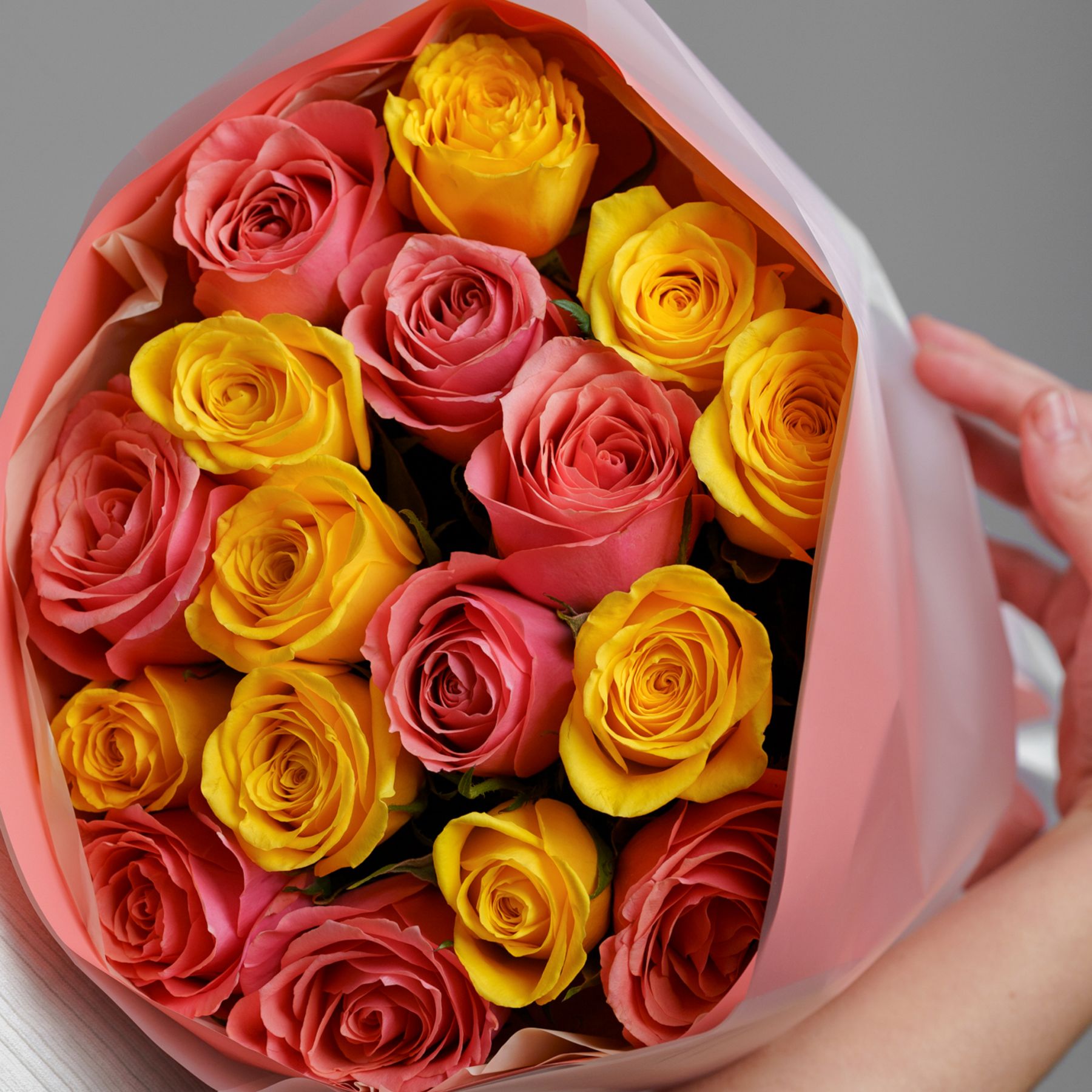 Красивый букет из 17 жёлто-коралловых роз длиной 40 см в круглой упаковке. Идеальный выбор для подарка или украшения интерьера. Цветы свежие и аккуратно собраны профессиональными флористами. Мы обеспечиваем бережную упаковку и быструю доставку по Самаре. Бесплатная доставка по Самаре.