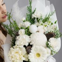 Светлая зимняя композиция в молочно-белой гамме с живой хвоей, хлопком и натуральными шишками. Белые цветы создают ощущение покоя, свежего воздуха и тихого зимнего утра.