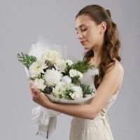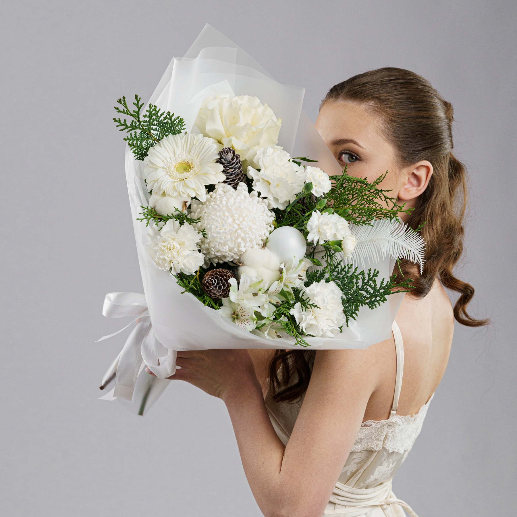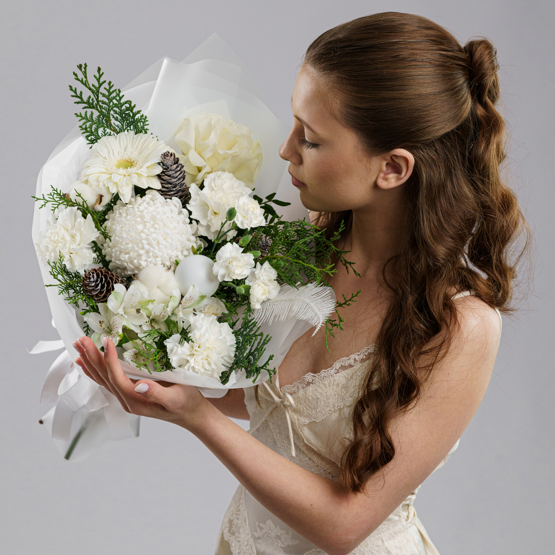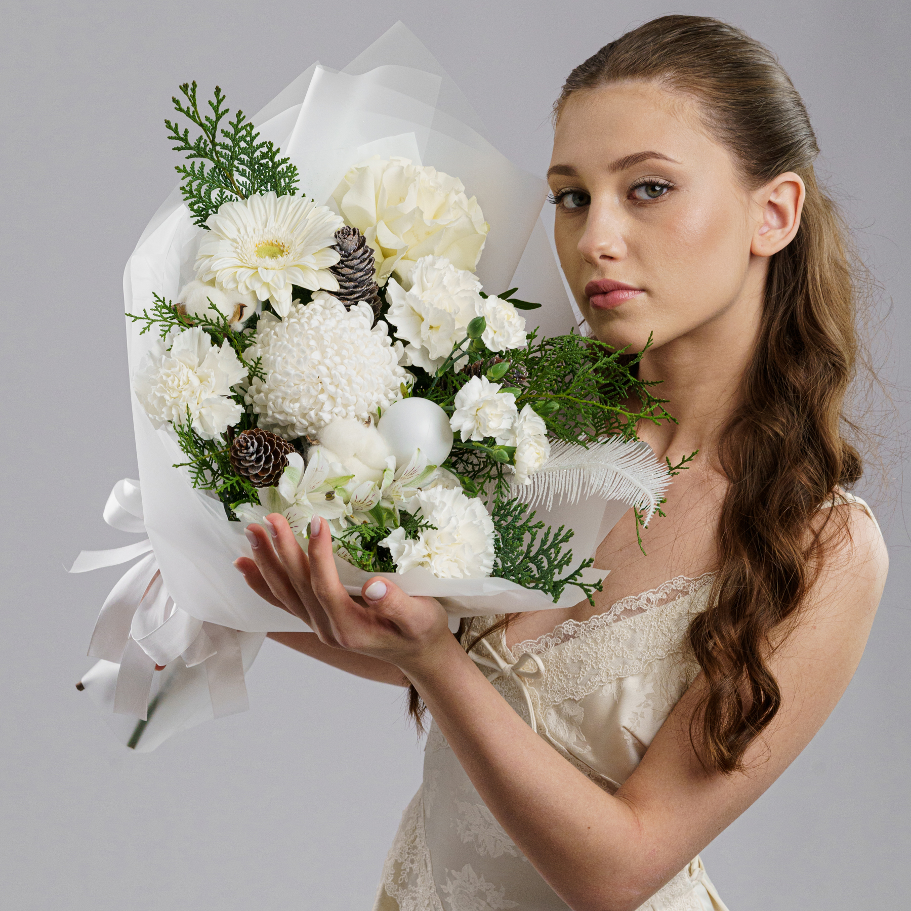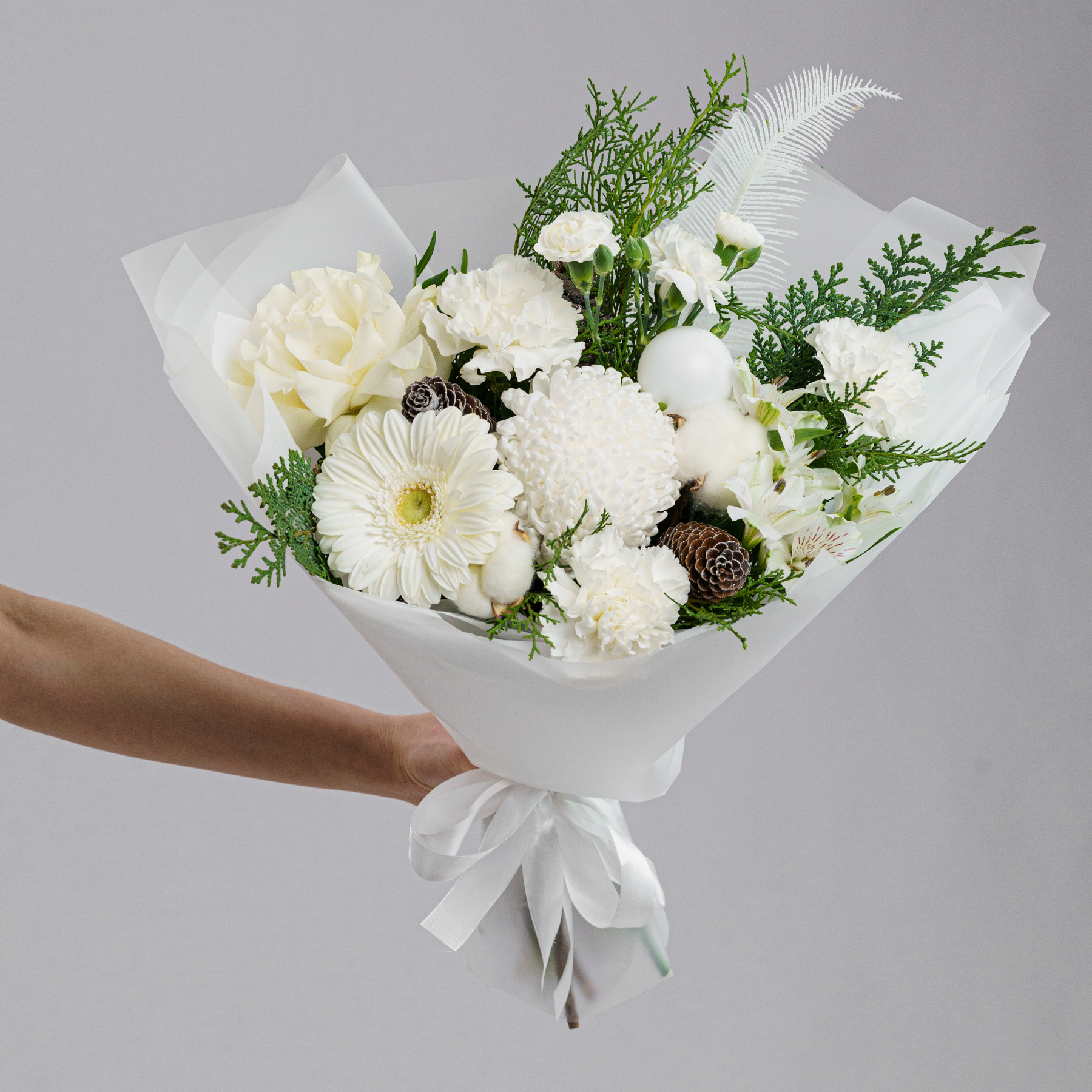 Светлая зимняя композиция в молочно-белой гамме с живой хвоей, хлопком и натуральными шишками. Белые цветы создают ощущение покоя, свежего воздуха и тихого зимнего утра.