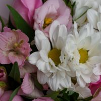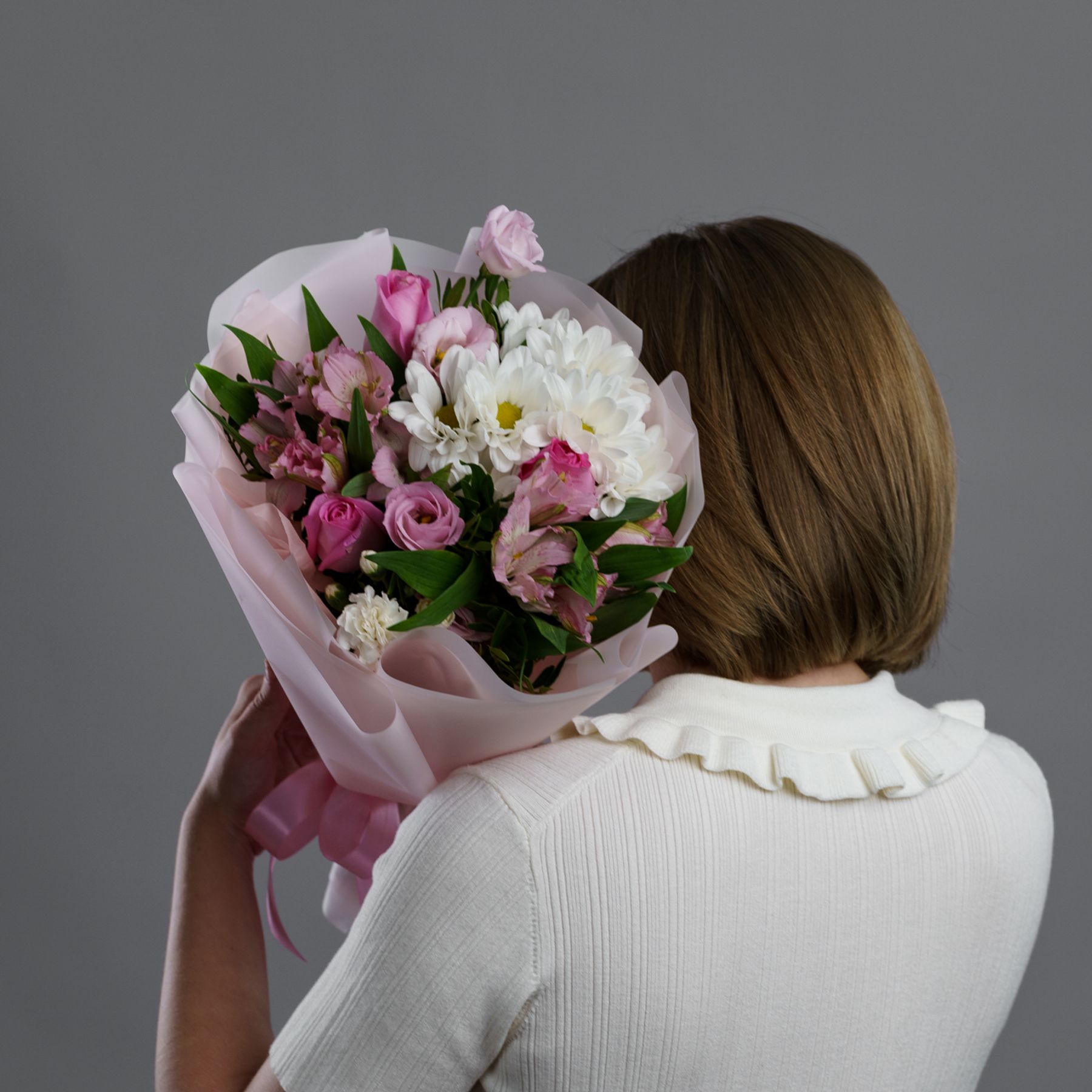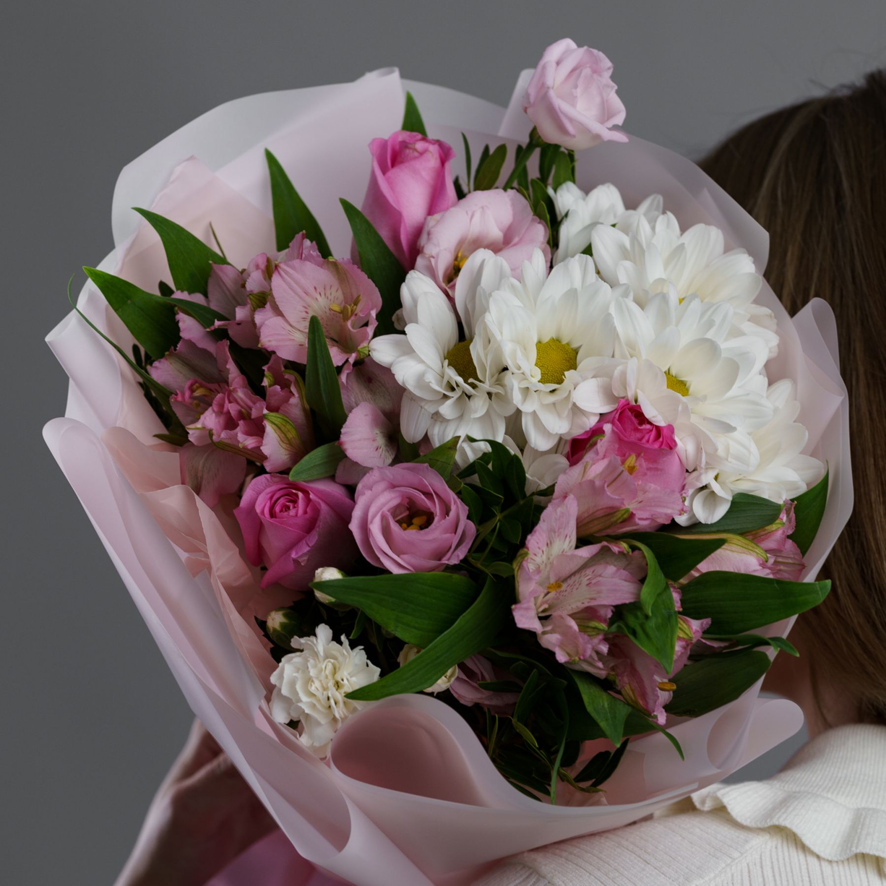Этот изысканный букет — гармоничное сочетание яркости и элегантности. В нём грациозно соседствуют хризантема и эустома, создавая нежный и свежий фон. Альстромерии изумляют своей необычной формой и насыщенными цветами, а кении добавляют живую динамичность. Кустовая гвоздика вносит нотки утончённой классики. Такой букет станет прекрасным подарком — символом красоты и гармонии.