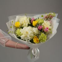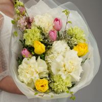 Этот букет — настоящее воплощение весеннего сада, полного солнца, свежести и нежных красок. Его радостная и гармоничная палитра, сочетающая в себе сливочно-белые, лимонно-желтые, салатовые и розовые оттенки, создает ощущение праздника и дарит заряд позитивной энергии.