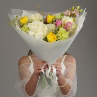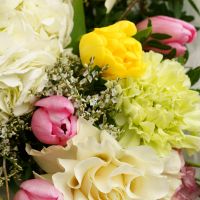 Этот букет — настоящее воплощение весеннего сада, полного солнца, свежести и нежных красок. Его радостная и гармоничная палитра, сочетающая в себе сливочно-белые, лимонно-желтые, салатовые и розовые оттенки, создает ощущение праздника и дарит заряд позитивной энергии.
