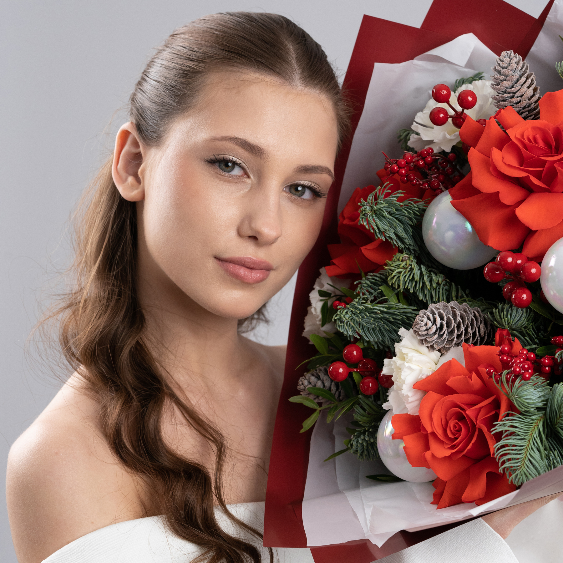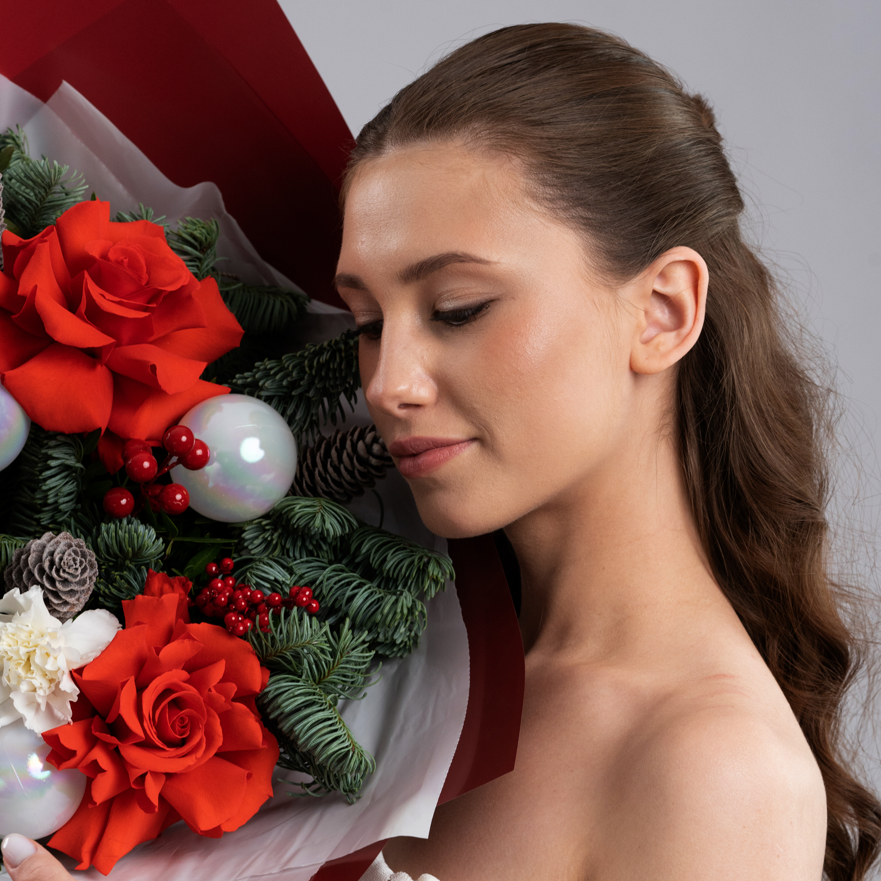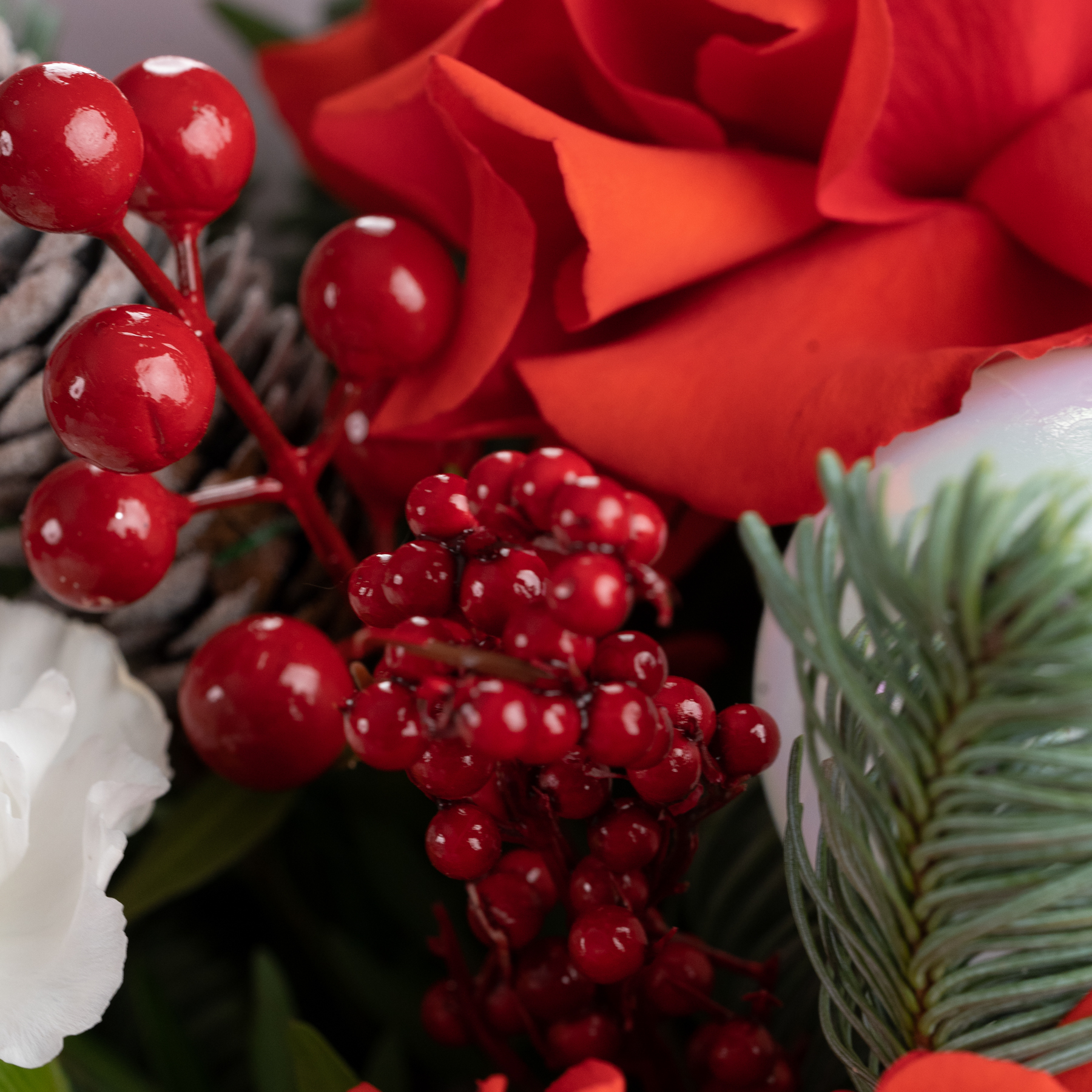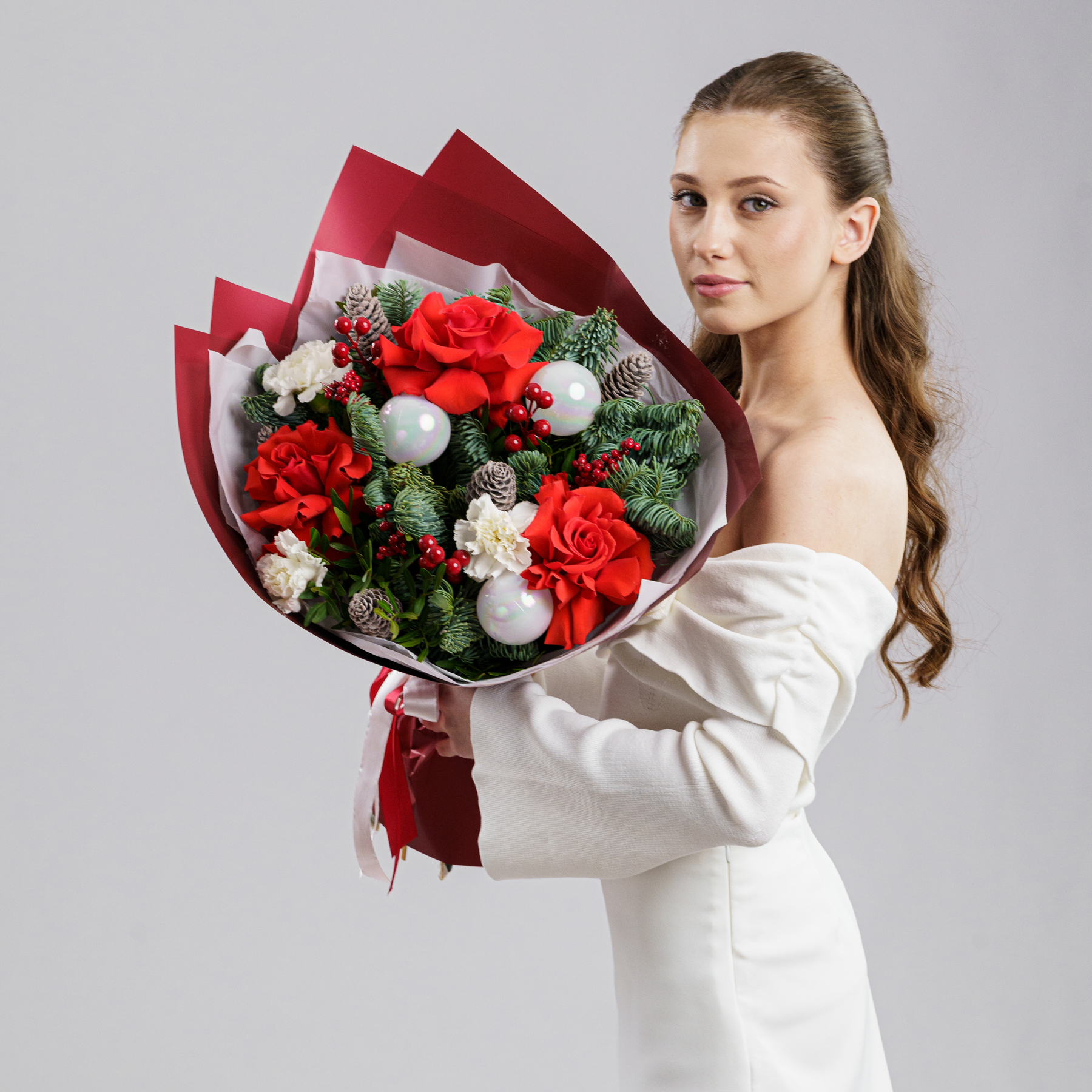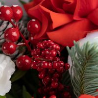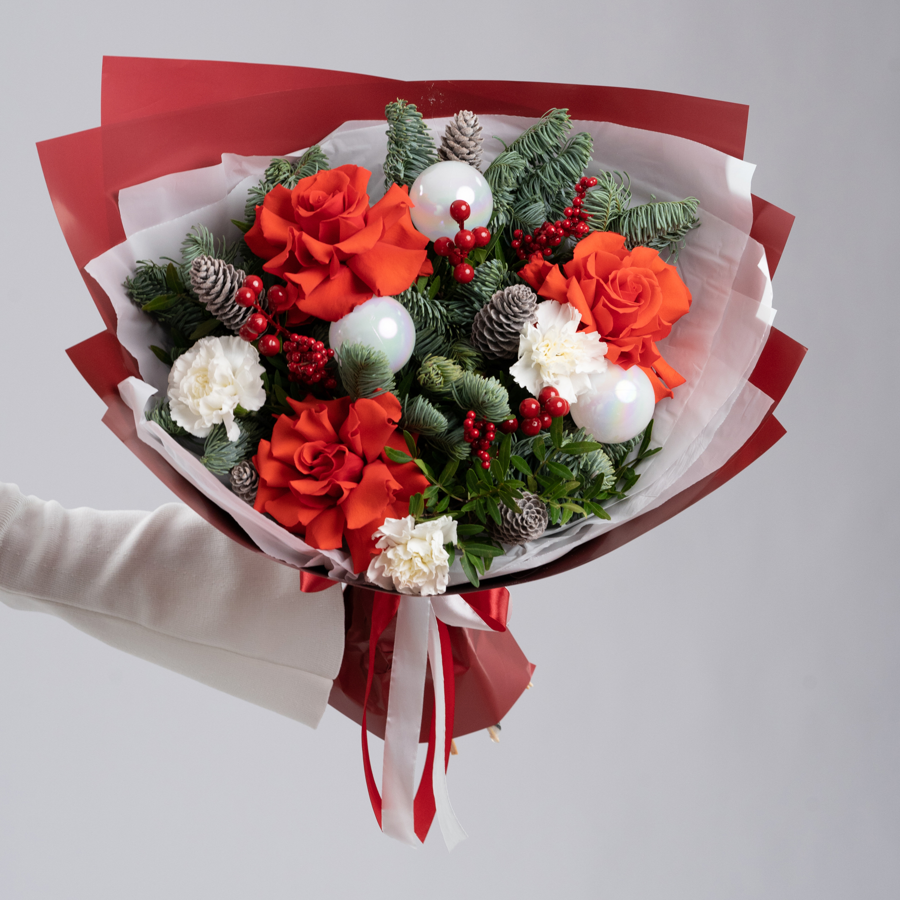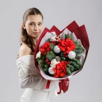 Праздничный букет с алыми розами, живой хвоей, ягодами и декоративными акцентами в красно-белой гамме. Натуральные шишки и хвоя добавляют ощущение зимы, а насыщенный красный цвет делает композицию выразительной и торжественной.