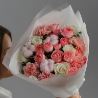 Здесь пионовидные розы теплого розового оттенка, белые розы, розовые гвоздики и пушистые шарики хлопка. Чистая палитра и молочная плёнка — идеальный выбор, если вы ищете нежный букет на день рождения или хотите заказать доставку цветов по Самаре «на сейчас». Универсально для девушки, жены, мамы, подруги. Для быстрых решений — онлайн-заказ цветов и срочная доставка.