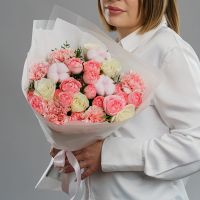 Здесь пионовидные розы теплого розового оттенка, белые розы, розовые гвоздики и пушистые шарики хлопка. Чистая палитра и молочная плёнка — идеальный выбор, если вы ищете нежный букет на день рождения или хотите заказать доставку цветов по Самаре «на сейчас». Универсально для девушки, жены, мамы, подруги. Для быстрых решений — онлайн-заказ цветов и срочная доставка.