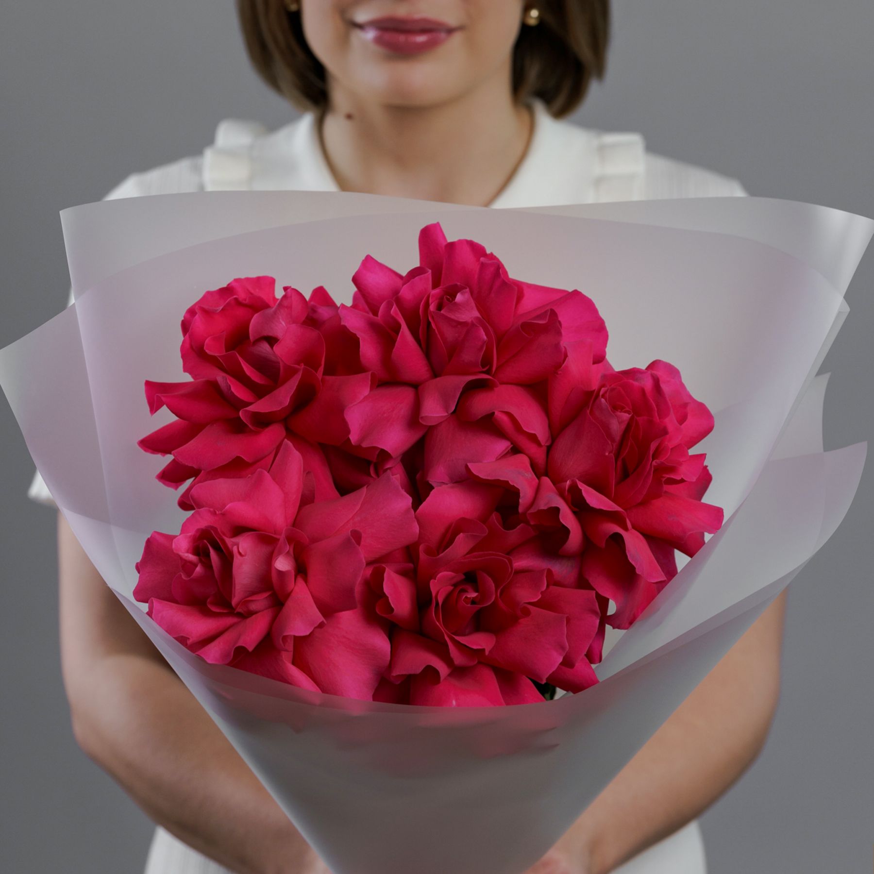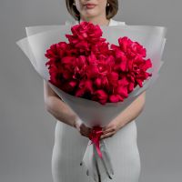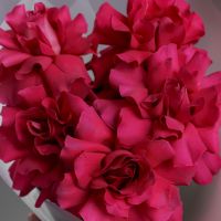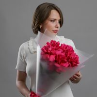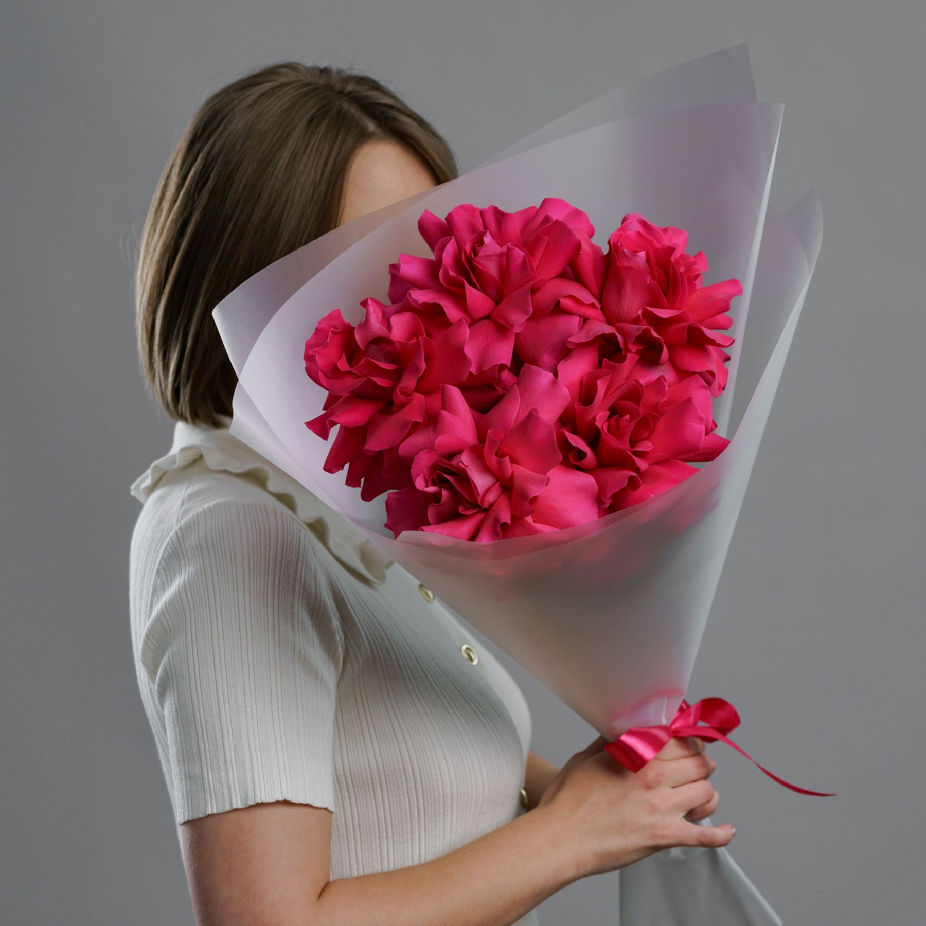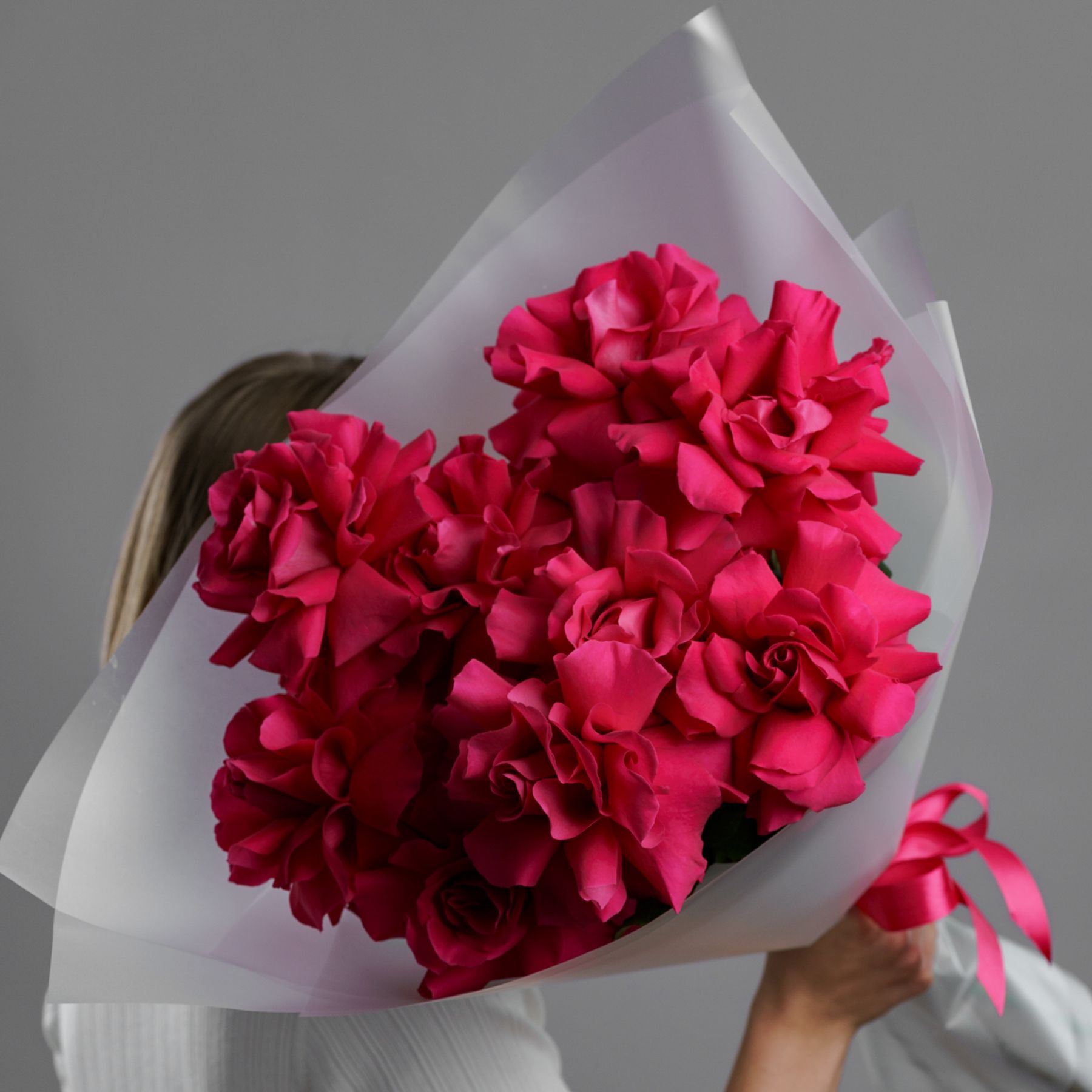 Бархатные бутоны насыщенного розового цвета, упакованные в воздушную полупрозрачную пленку. Этот прием не скрывает красоту, а лишь подчеркивает ее, добавляя букету легкости и современной элегантности. Яркие лепестки просвечивают сквозь дымчатый флер, создавая игру света и тени. Такой букет — это идеальное сочетание страсти и утонченного парижского стиля.
