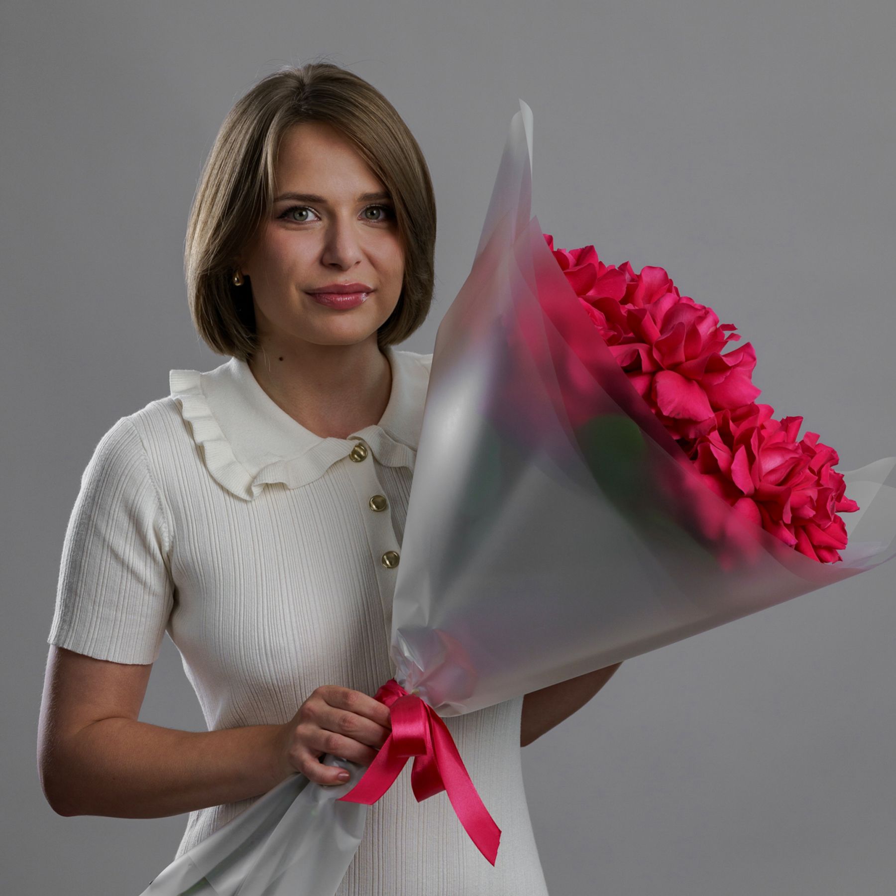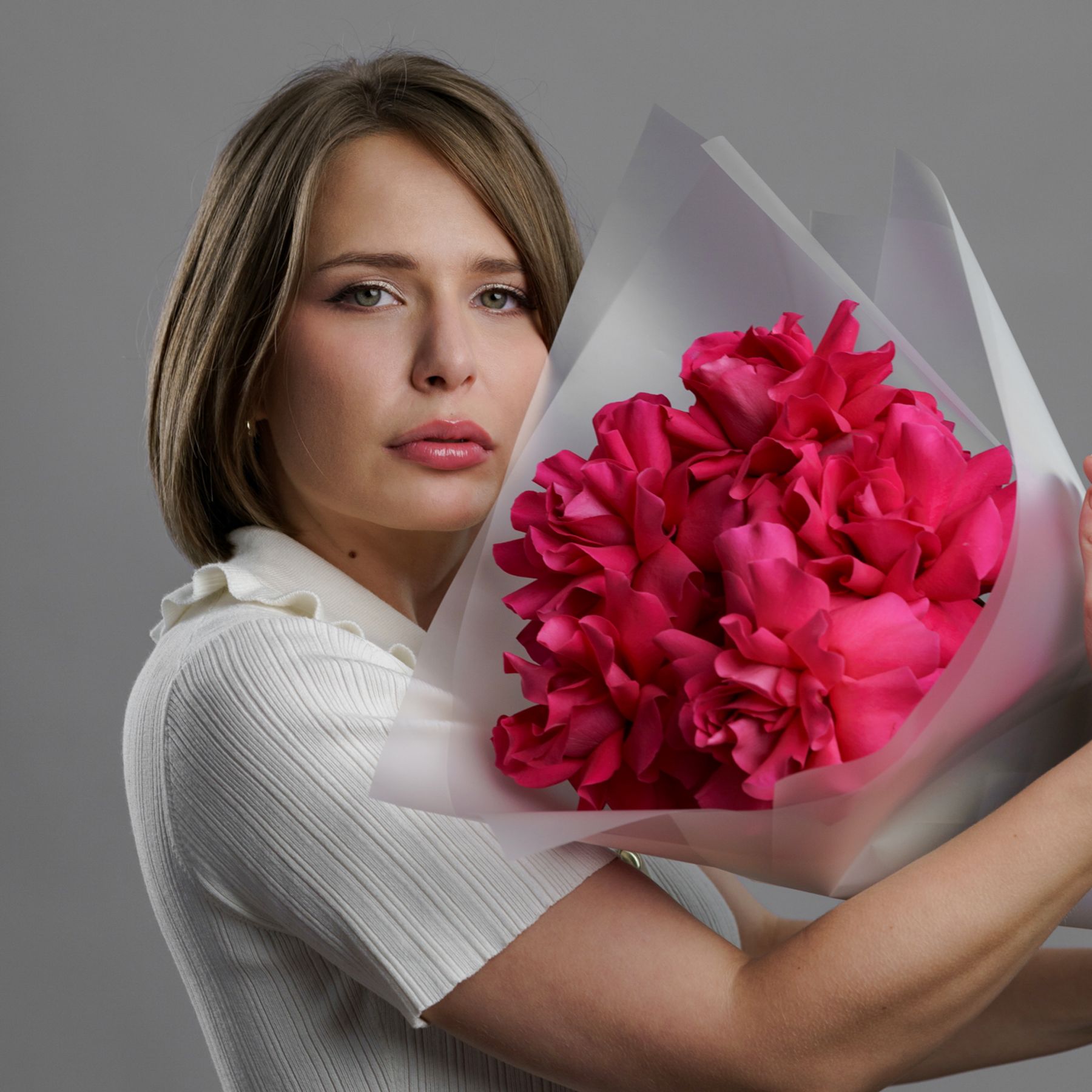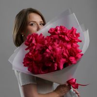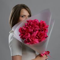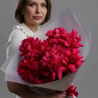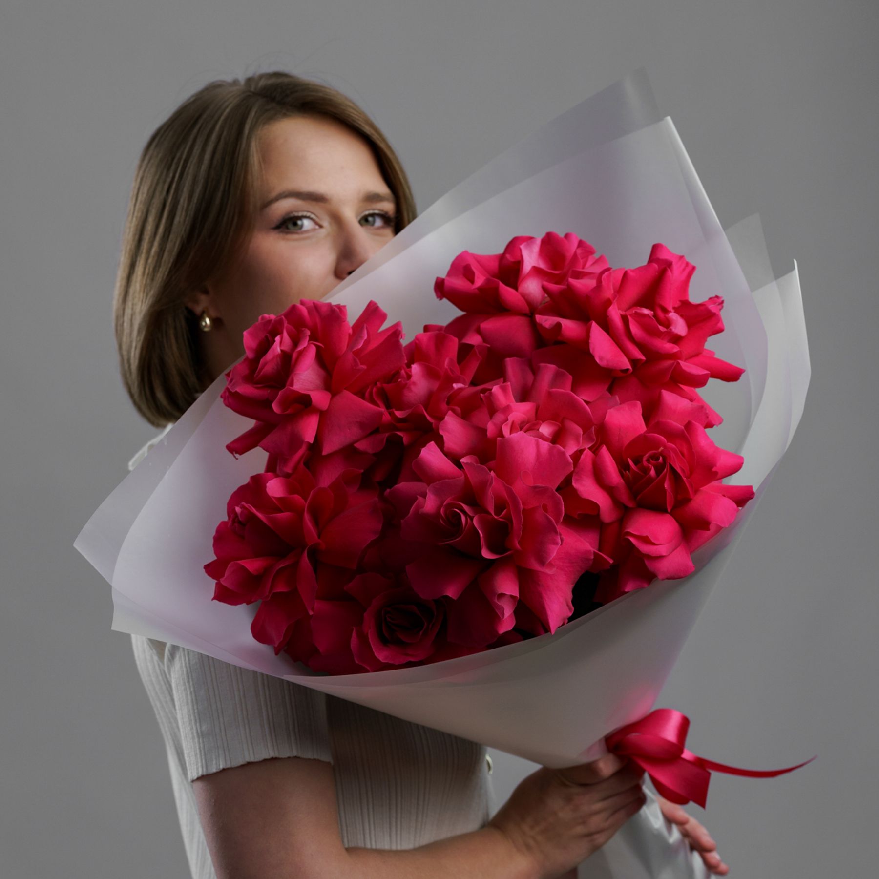 Бархатные бутоны насыщенного розового цвета, упакованные в воздушную полупрозрачную пленку. Этот прием не скрывает красоту, а лишь подчеркивает ее, добавляя букету легкости и современной элегантности. Яркие лепестки просвечивают сквозь дымчатый флер, создавая игру света и тени. Такой букет — это идеальное сочетание страсти и утонченного парижского стиля.