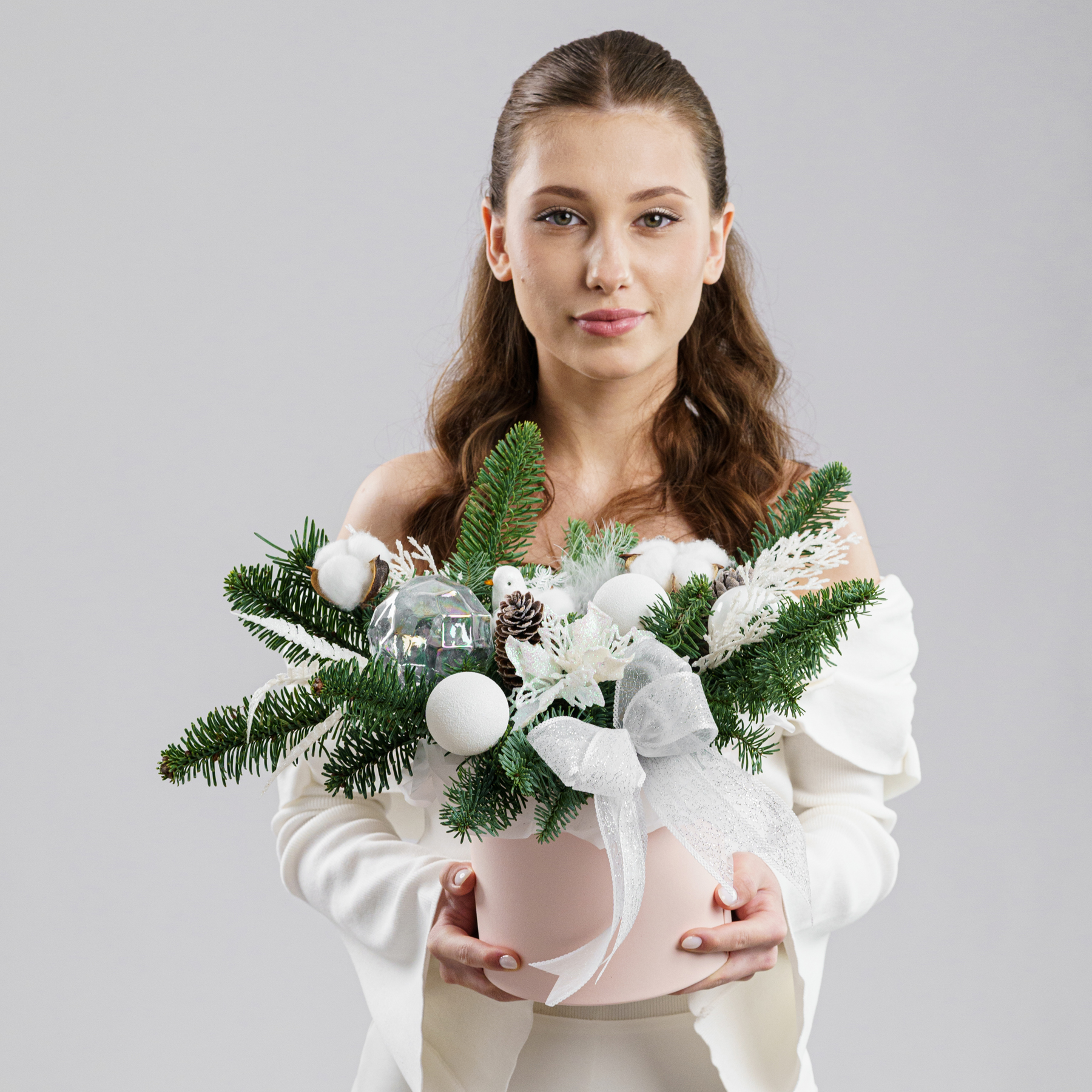 Хвойная интерьерная композиция в молочно-белой гамме с живой хвоей, хлопком, шишками и холодными акцентами из прозрачных и матовых шаров. Лёгкие текстильные банты и белый декор создают ощущение морозного воздуха и тихого зимнего света.