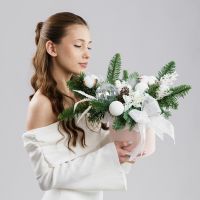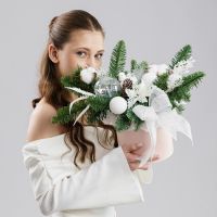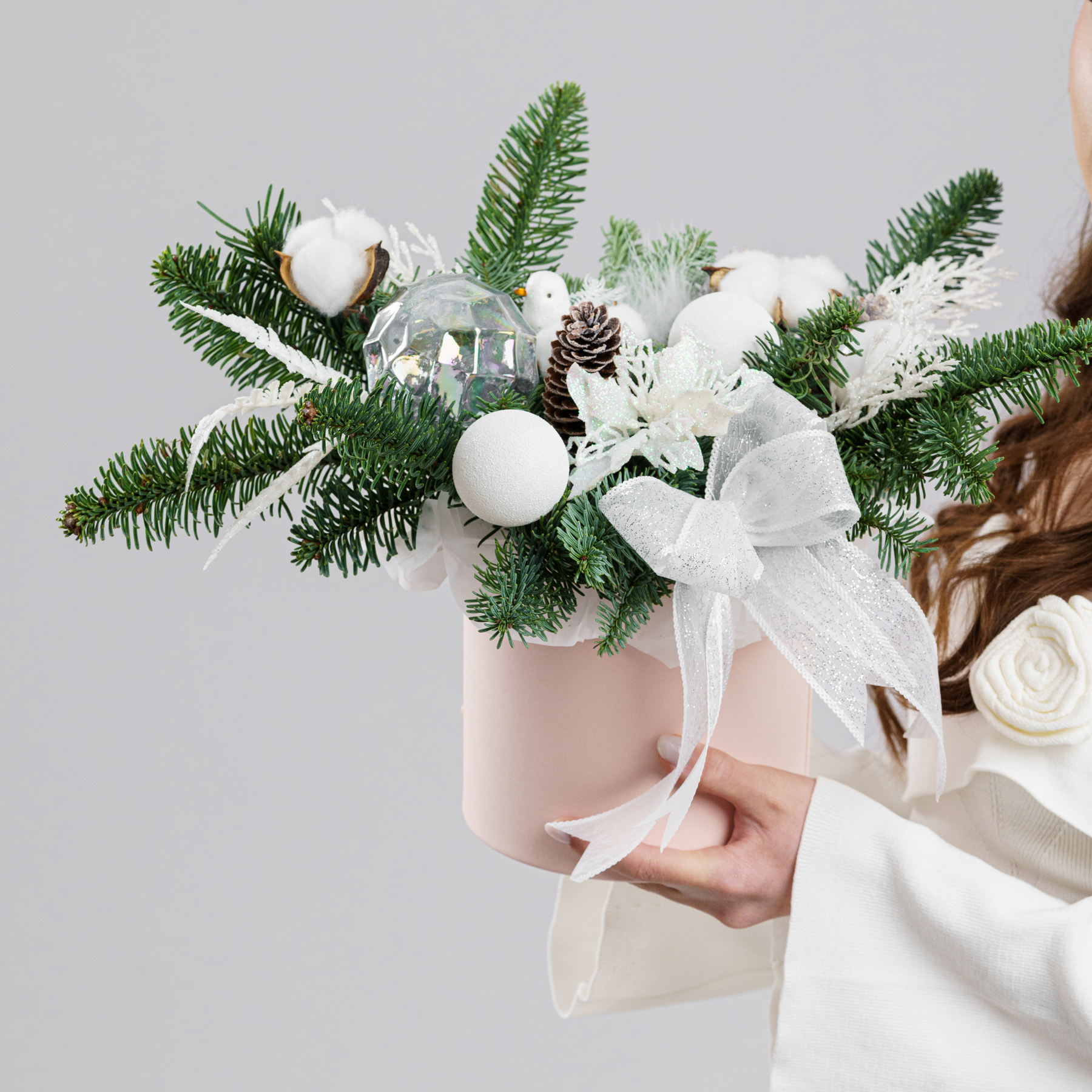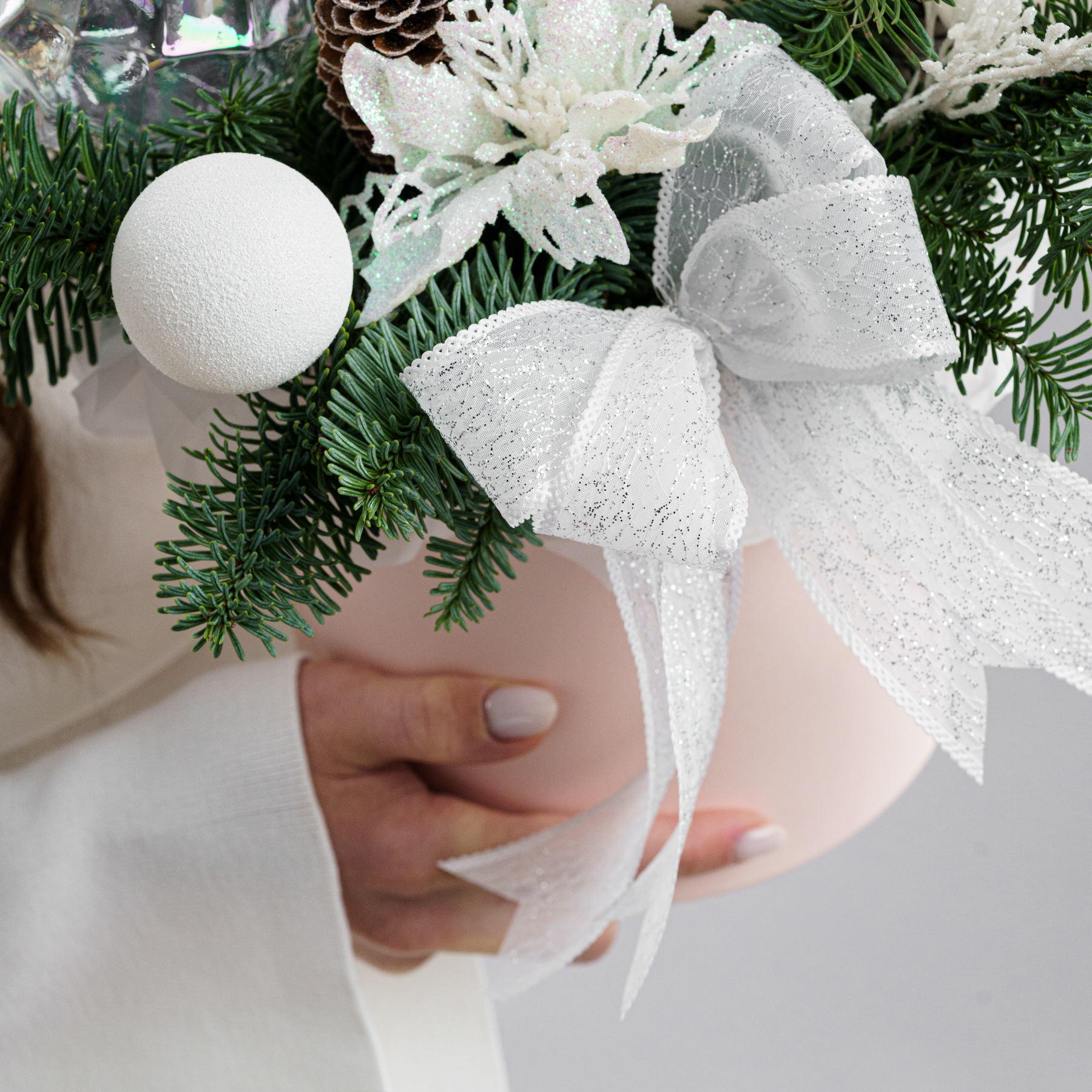 Хвойная интерьерная композиция в молочно-белой гамме с живой хвоей, хлопком, шишками и холодными акцентами из прозрачных и матовых шаров. Лёгкие текстильные банты и белый декор создают ощущение морозного воздуха и тихого зимнего света.