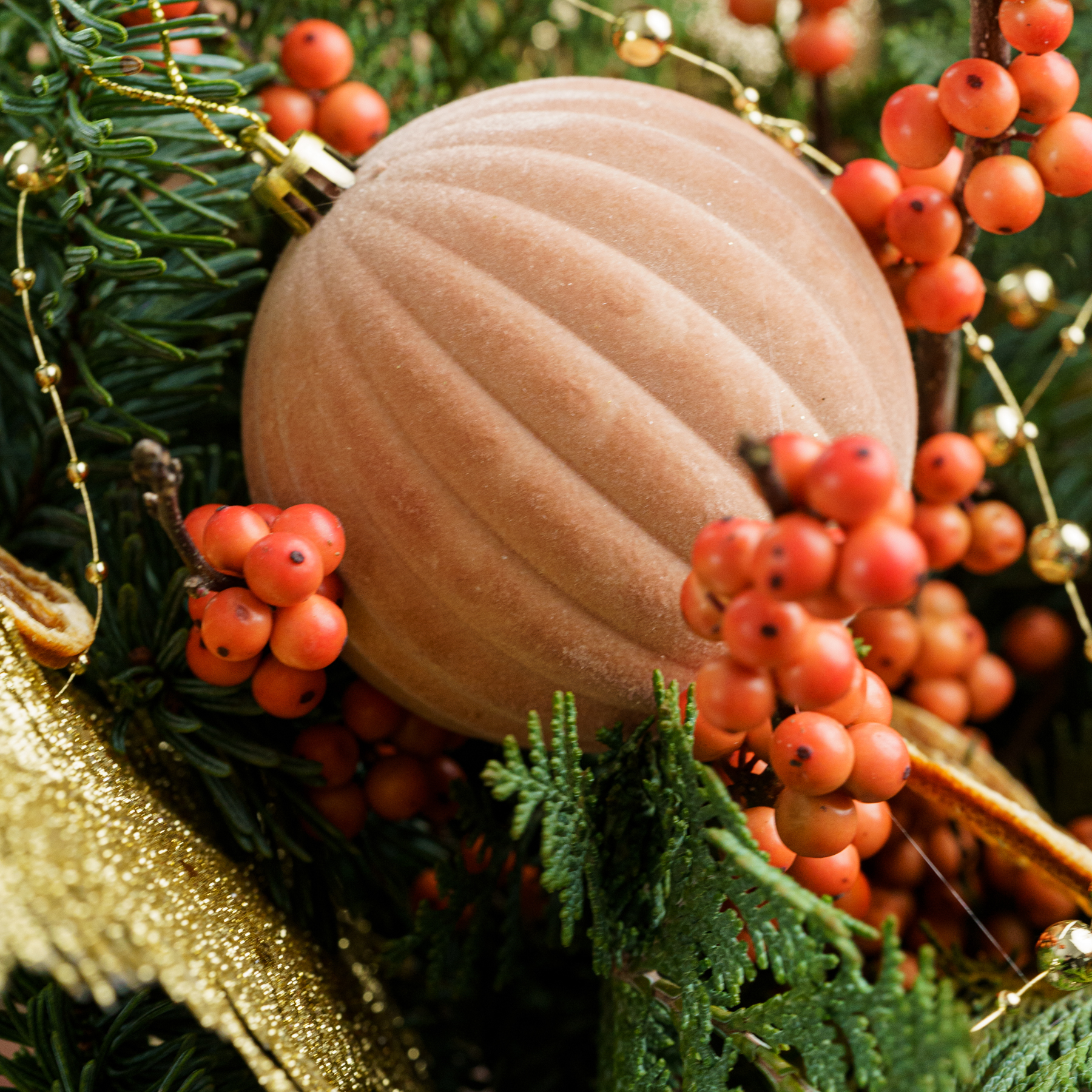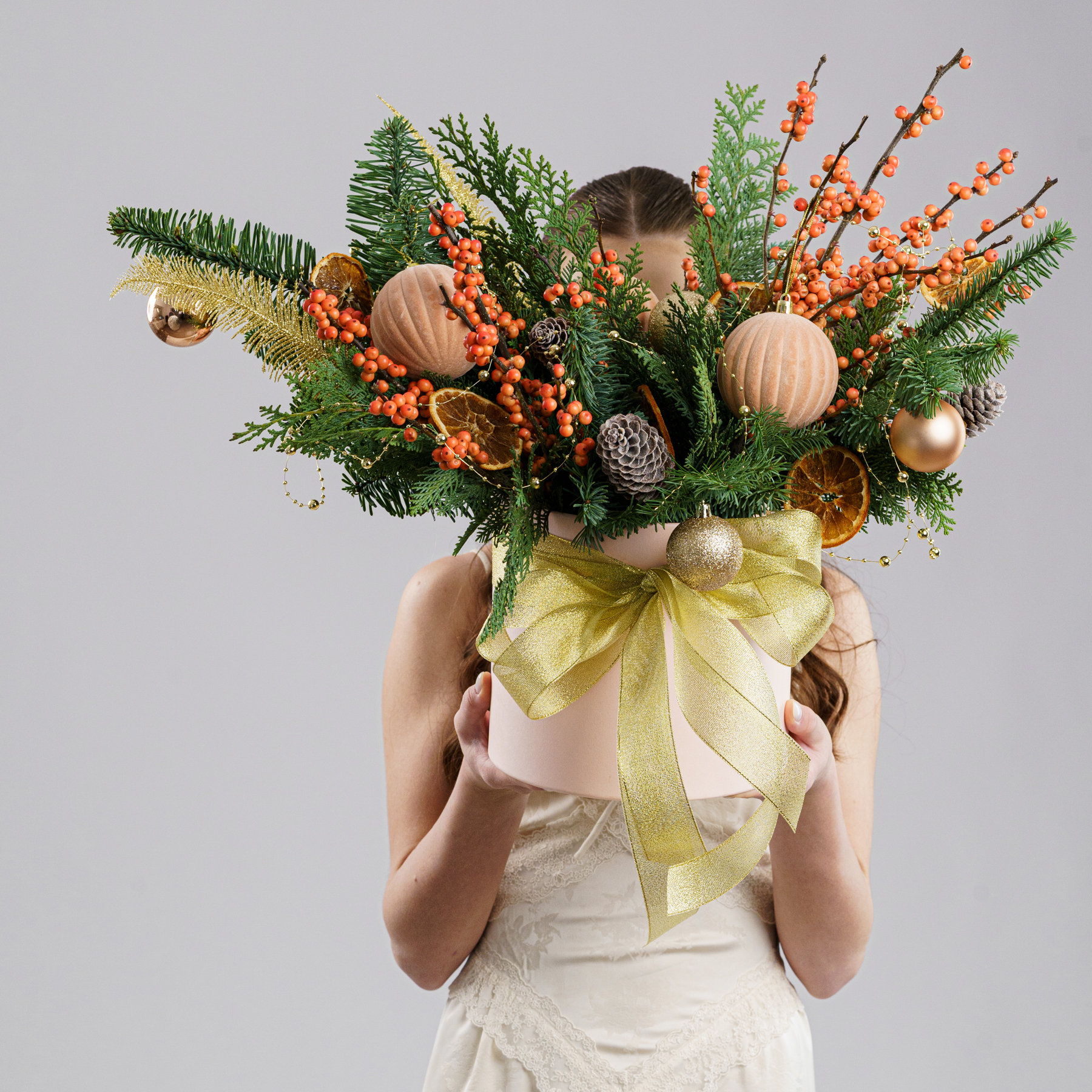 Живая хвоя, апельсин, ягоды и тёплое золото создают атмосферу уюта и домашнего праздника.