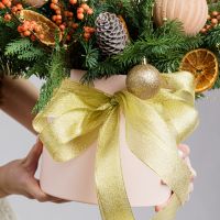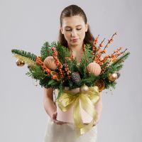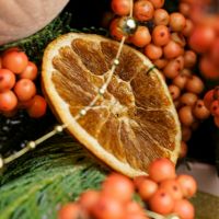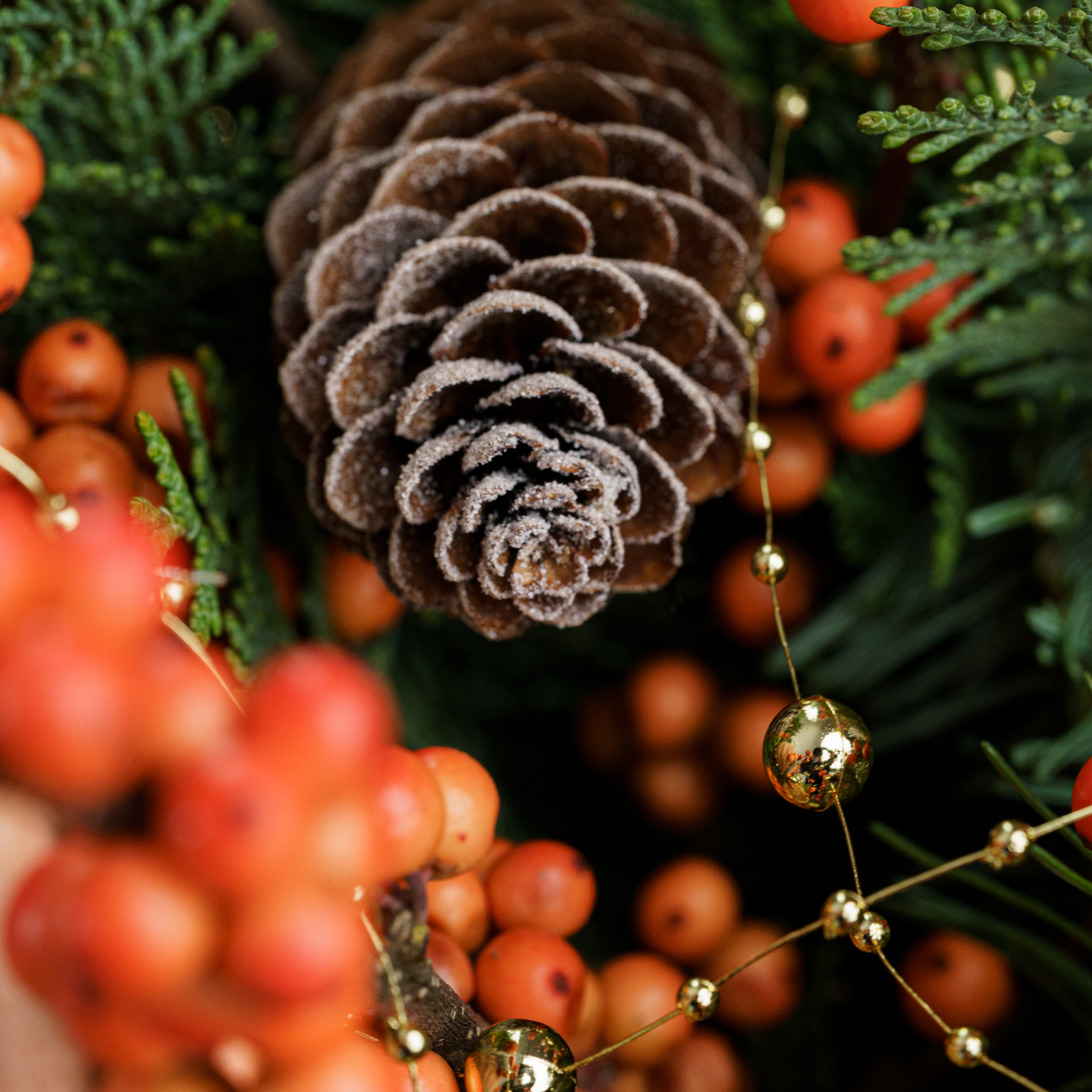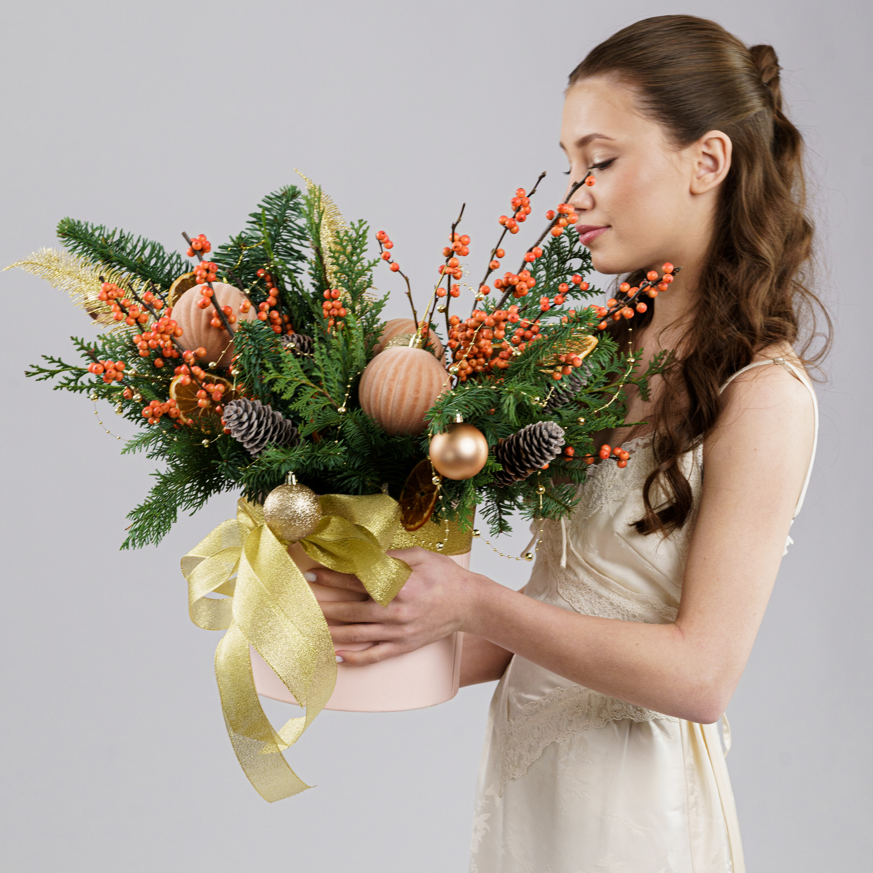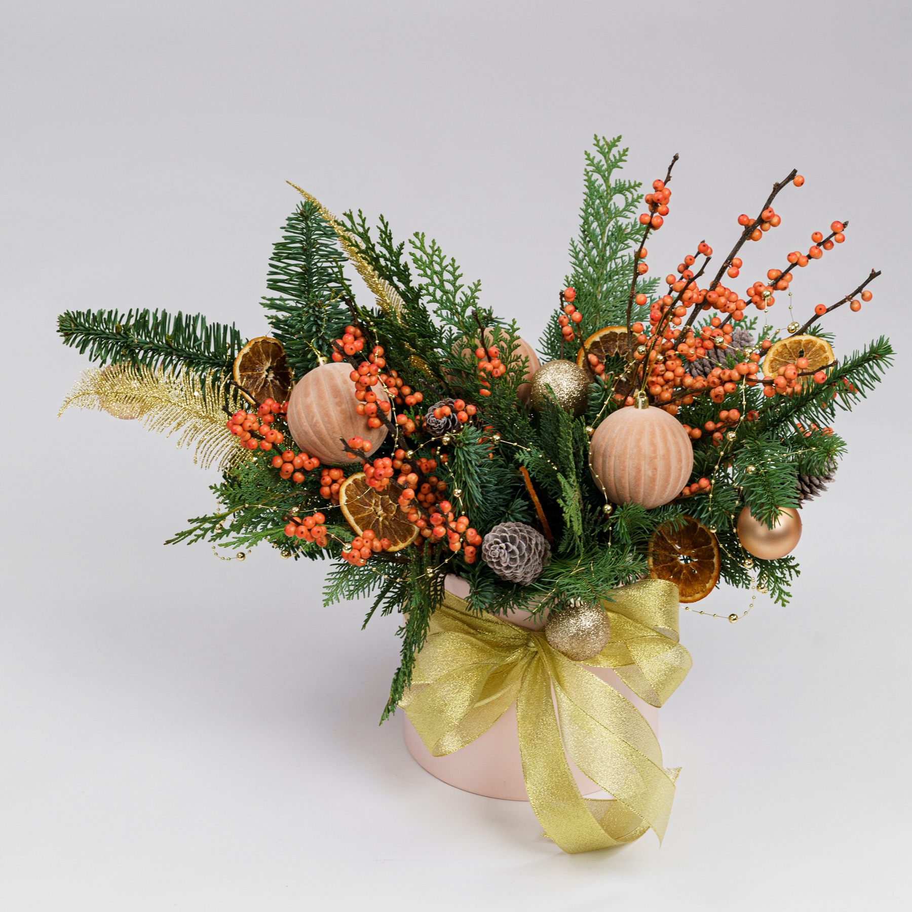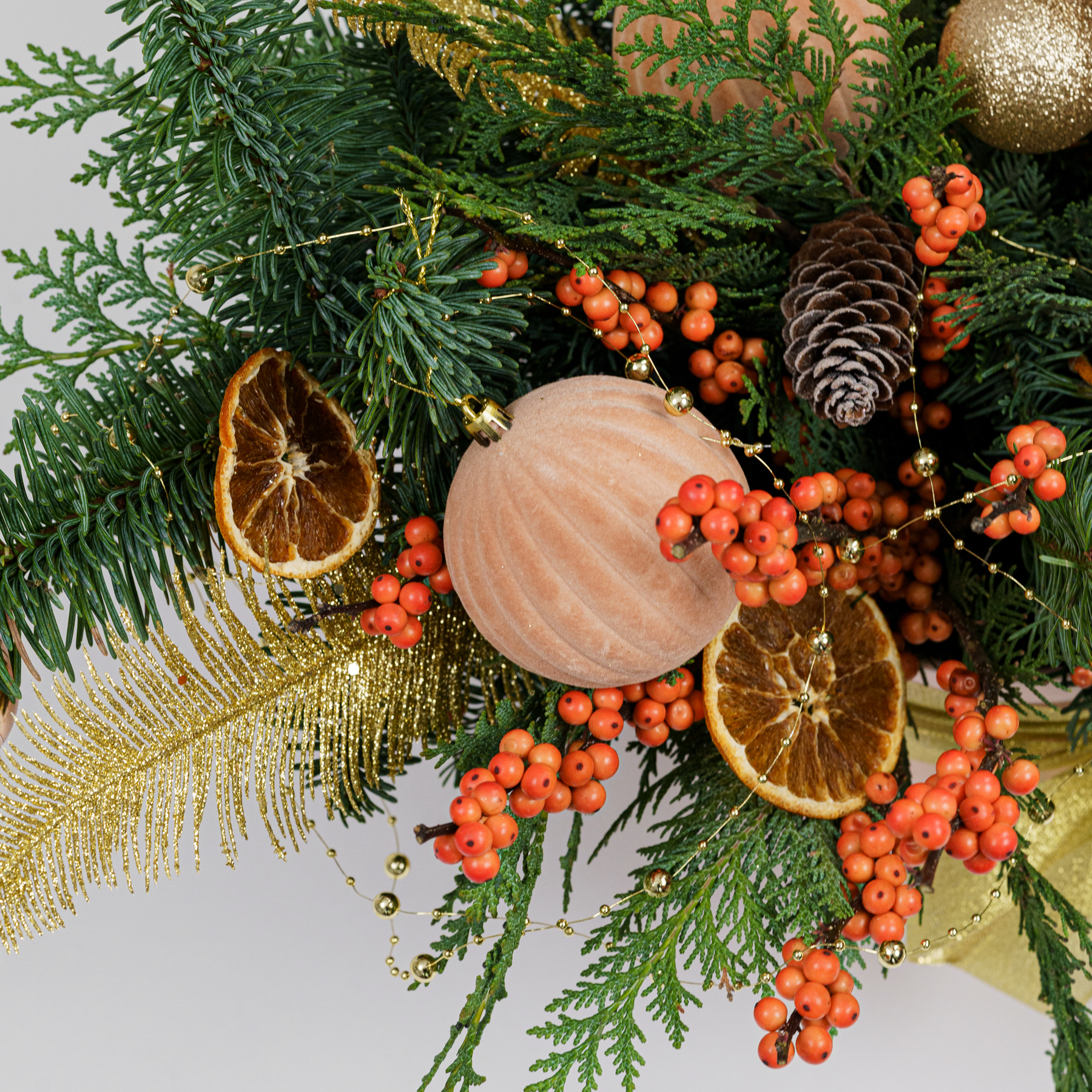 Живая хвоя, апельсин, ягоды и тёплое золото создают атмосферу уюта и домашнего праздника.
