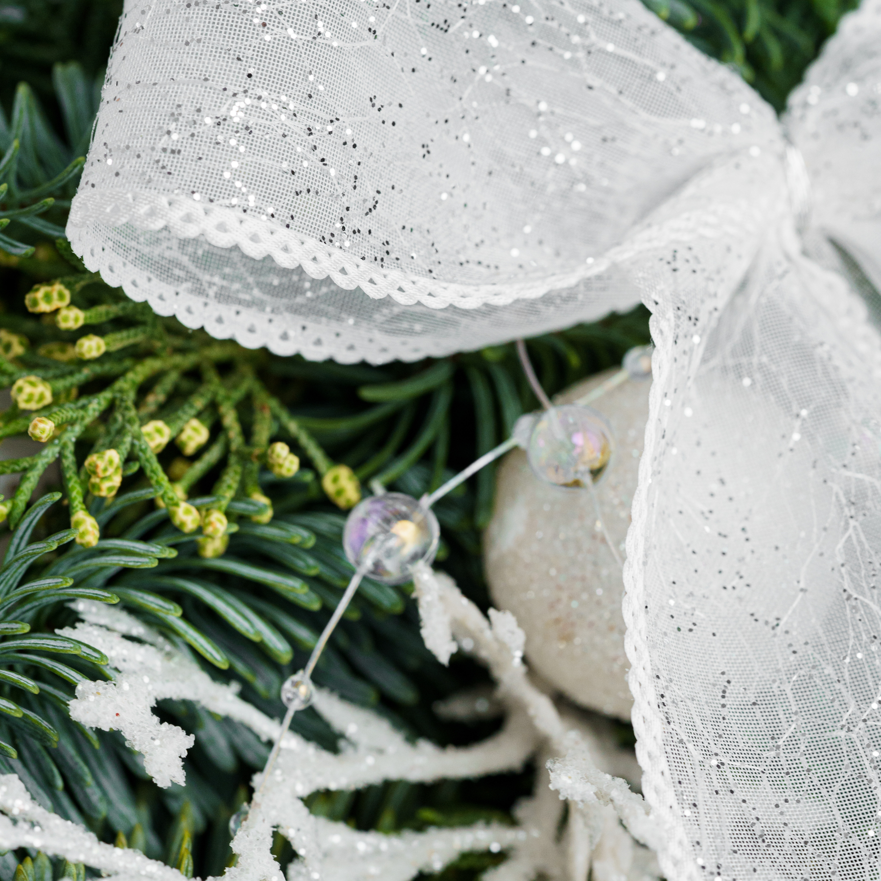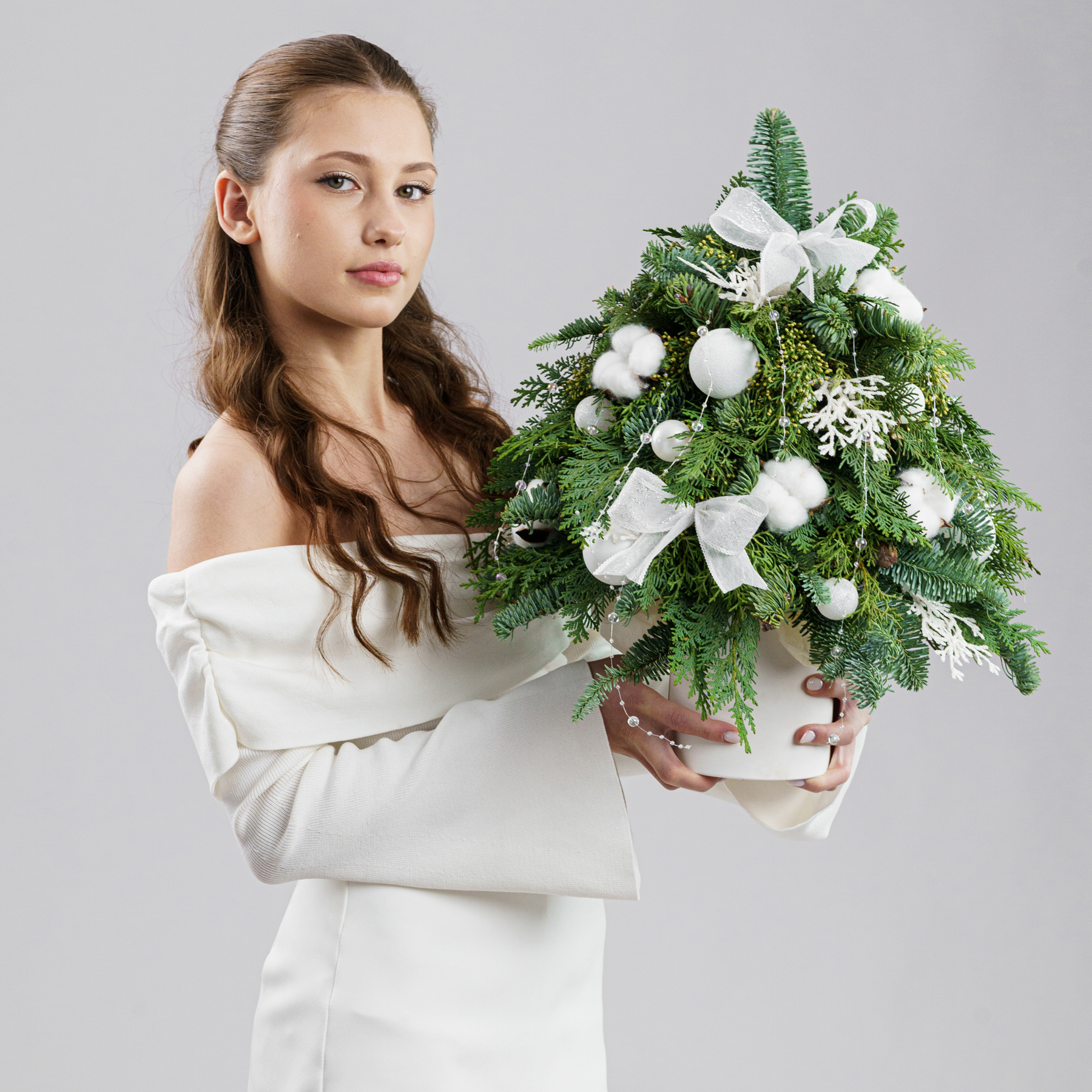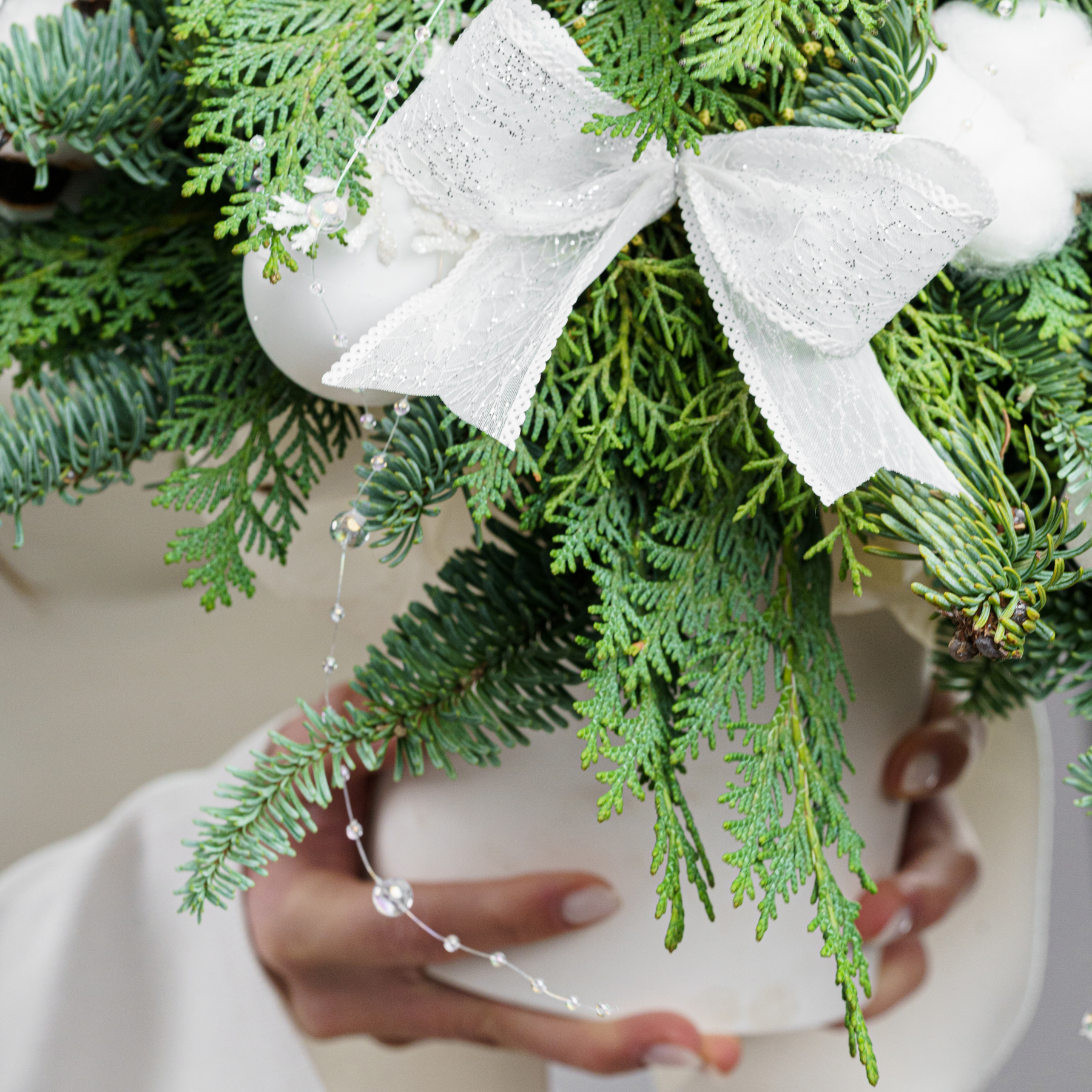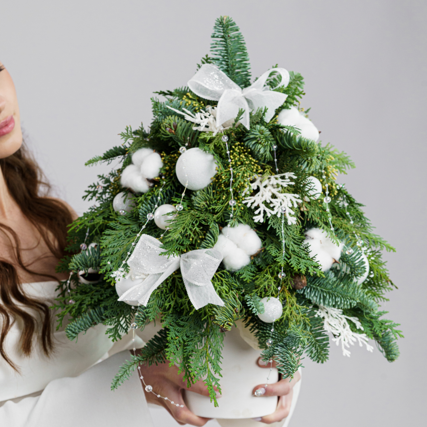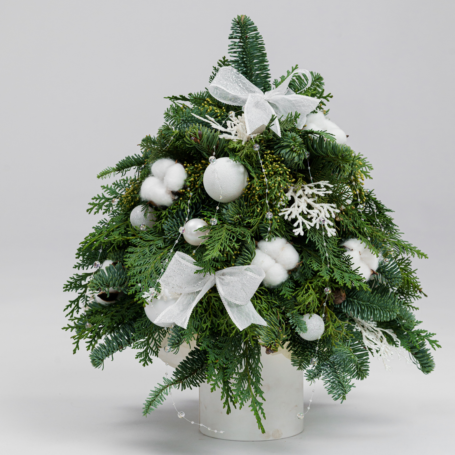 Интерьерная ёлка высотой 45 см, выполненная из свежей хвои с молочно-белыми акцентами, хлопком, изящными шарами и текстильными бантами. Декор выстроен деликатно и симметрично, подчёркивая форму и естественную красоту хвои.