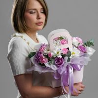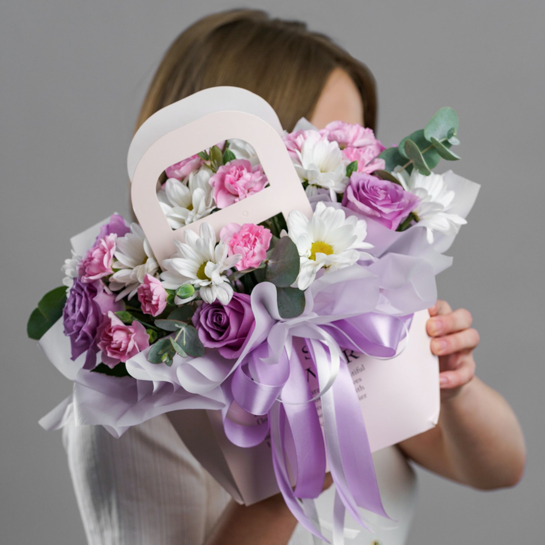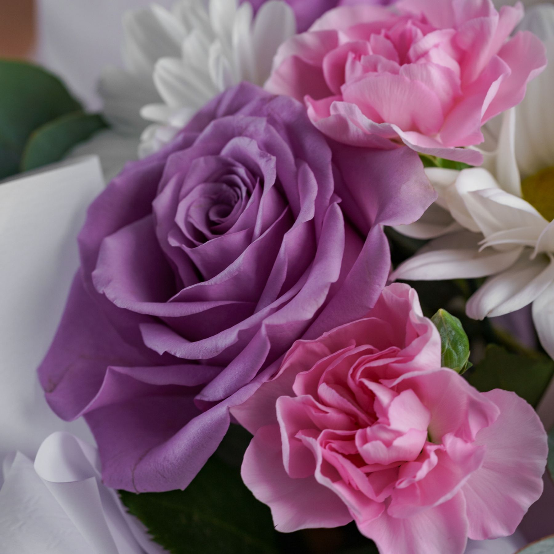 Подарите яркий букет с фиолетовой розой, хризантемой, эвкалиптом и кустовой гвоздикой. Композиция в стильной сумке фреш станет прекрасным подарком для любого случая. Закажите у профессиональных флористов с бесплатной доставкой по Самаре. Мы обеспечиваем бережных курьеров и быструю доставку букетов.
