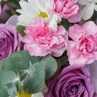 Подарите яркий букет с фиолетовой розой, хризантемой, эвкалиптом и кустовой гвоздикой. Композиция в стильной сумке фреш станет прекрасным подарком для любого случая. Закажите у профессиональных флористов с бесплатной доставкой по Самаре. Мы обеспечиваем бережных курьеров и быструю доставку букетов.
