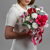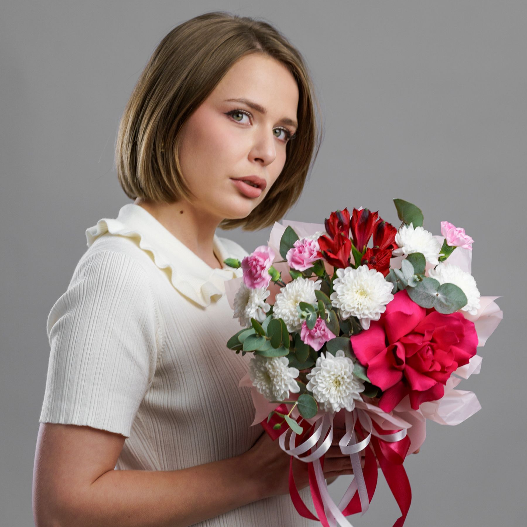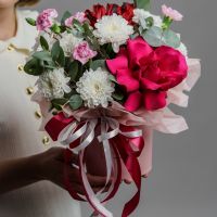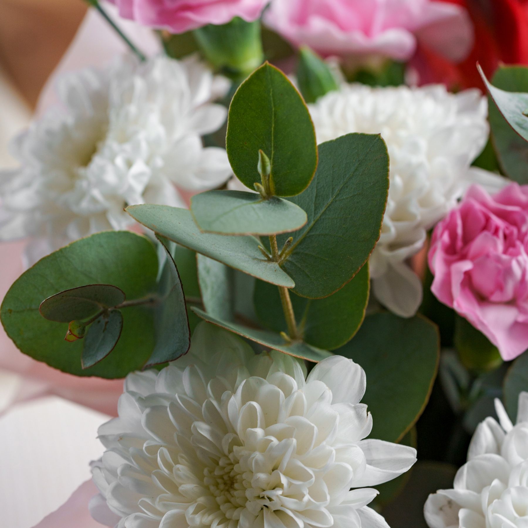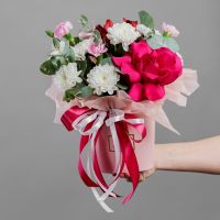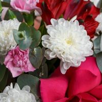Элегантная композиция с французской розой Пинк Флойд, альстромерией, гвоздикой, эвкалиптом и хризантемой. Букет размещен в коробке с оазисом для сохранения свежести. Подходит для любого праздника или как приятный подарок.