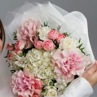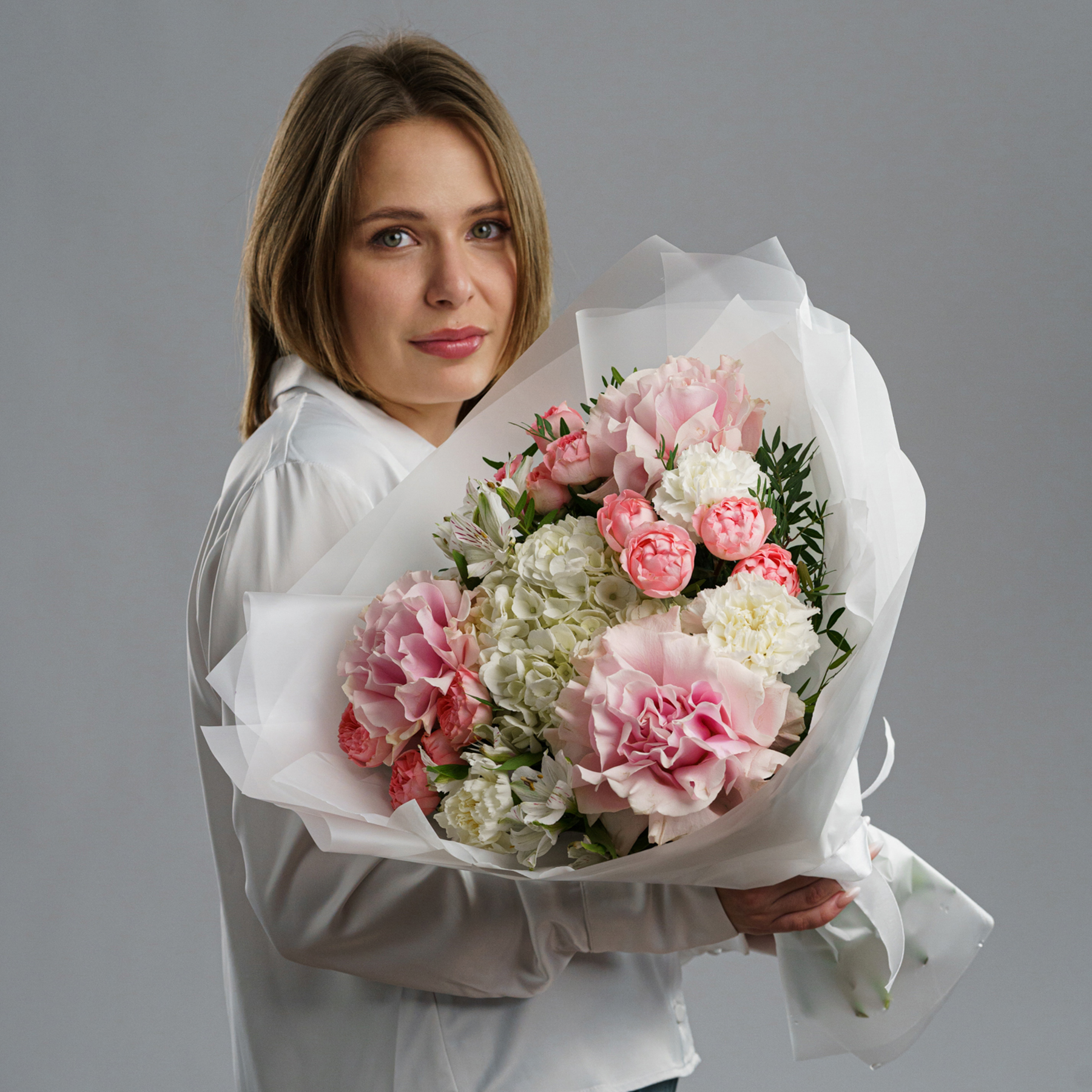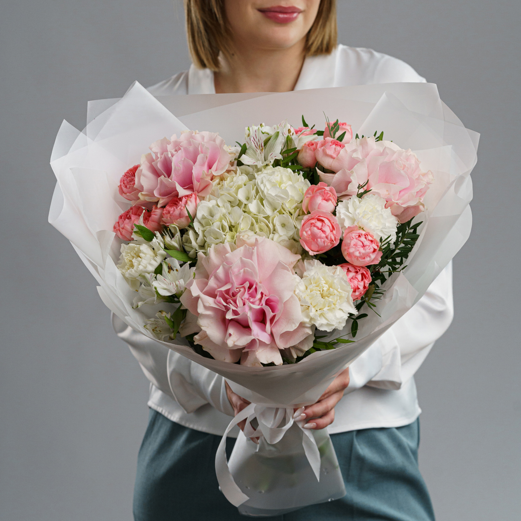 Романтичный букет с акцентом на текстуру: нежные розовые розы и кустовые розы, белая гортензия, кремовые гвоздики и альстромерия. Подходит для годовщины, благодарности, «просто так». Хотите купить цветы быстро и удобно? Заказывайте онлайн — бесплатная доставка на дом. Гарантируем свежесть букета и приятный сервис.