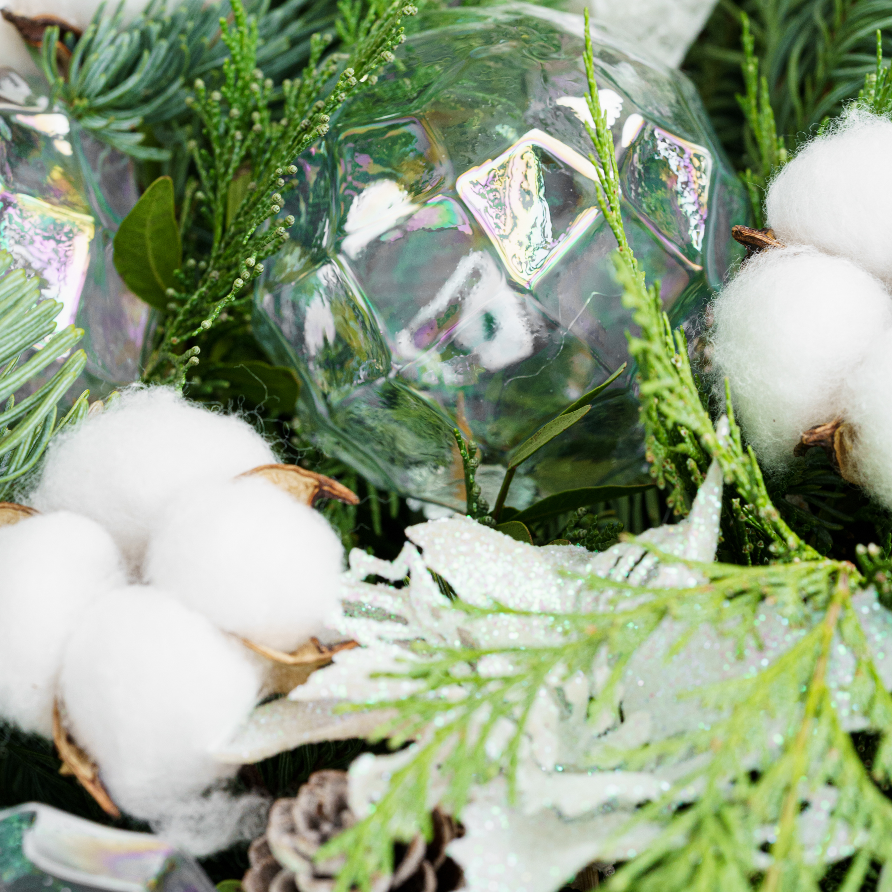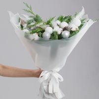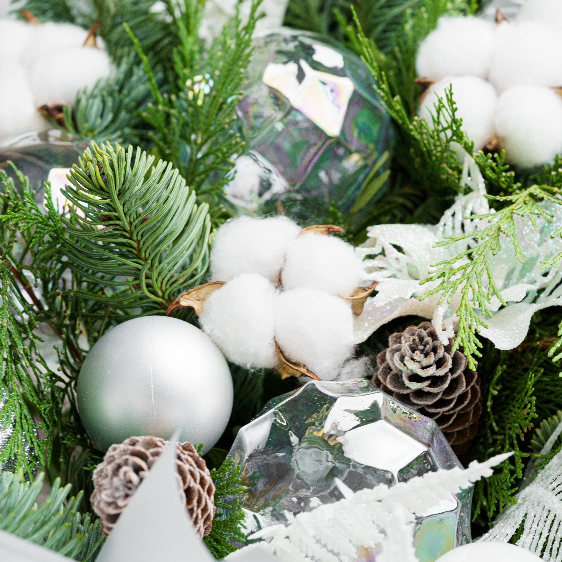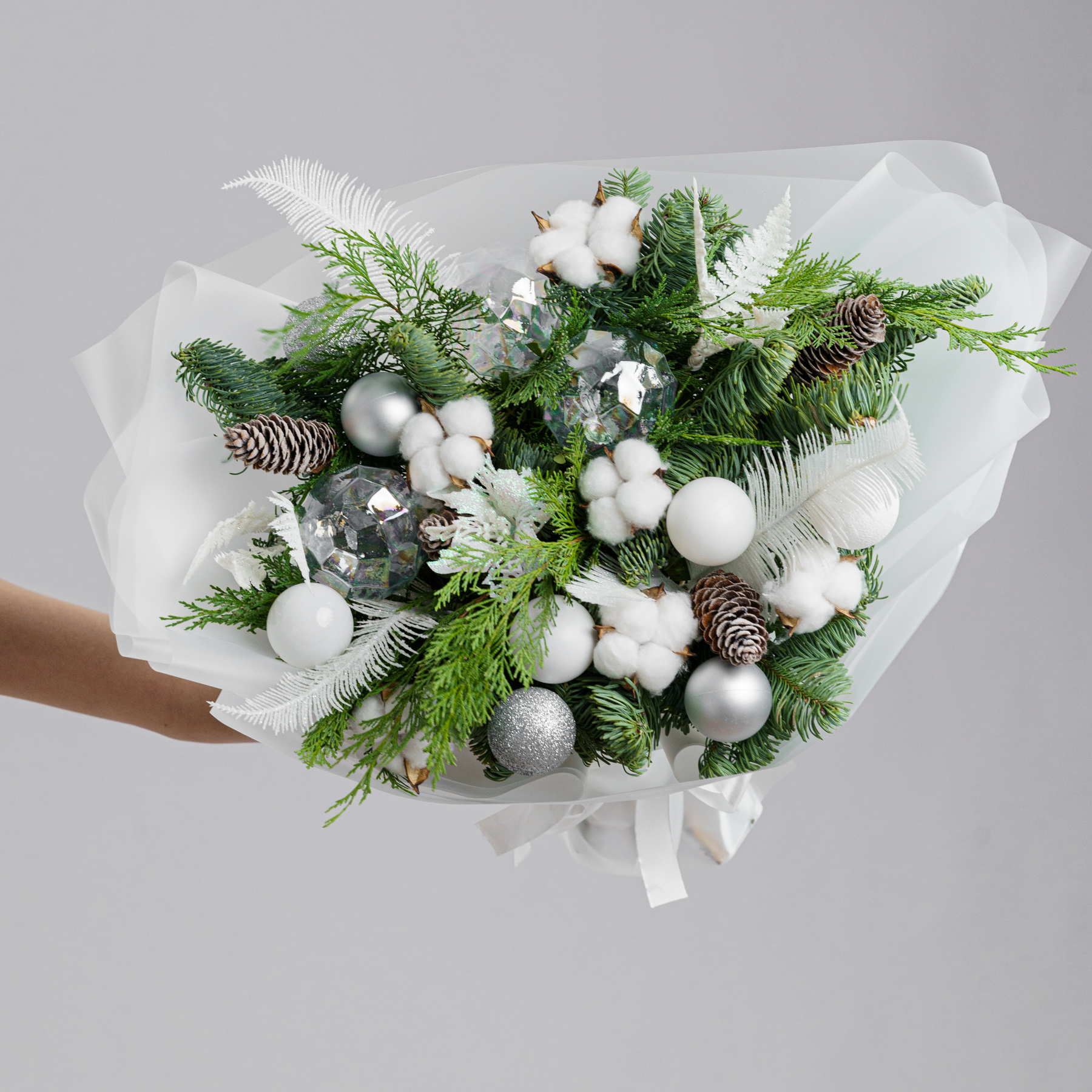 Современная хвойная композиция из живой хвои с молочно-белыми акцентами, хлопком и холодным серебром.