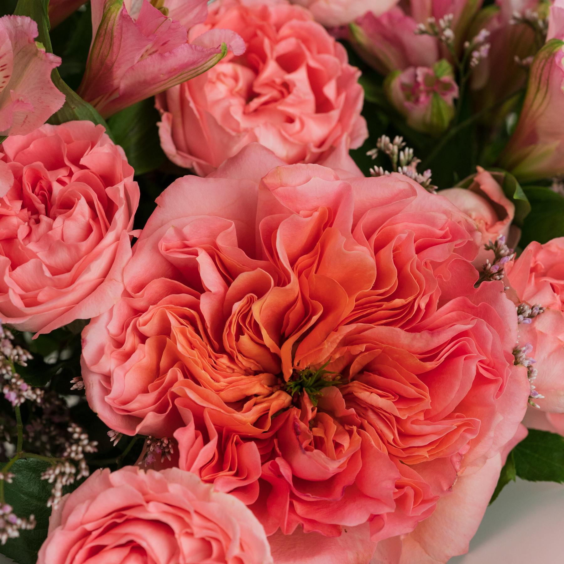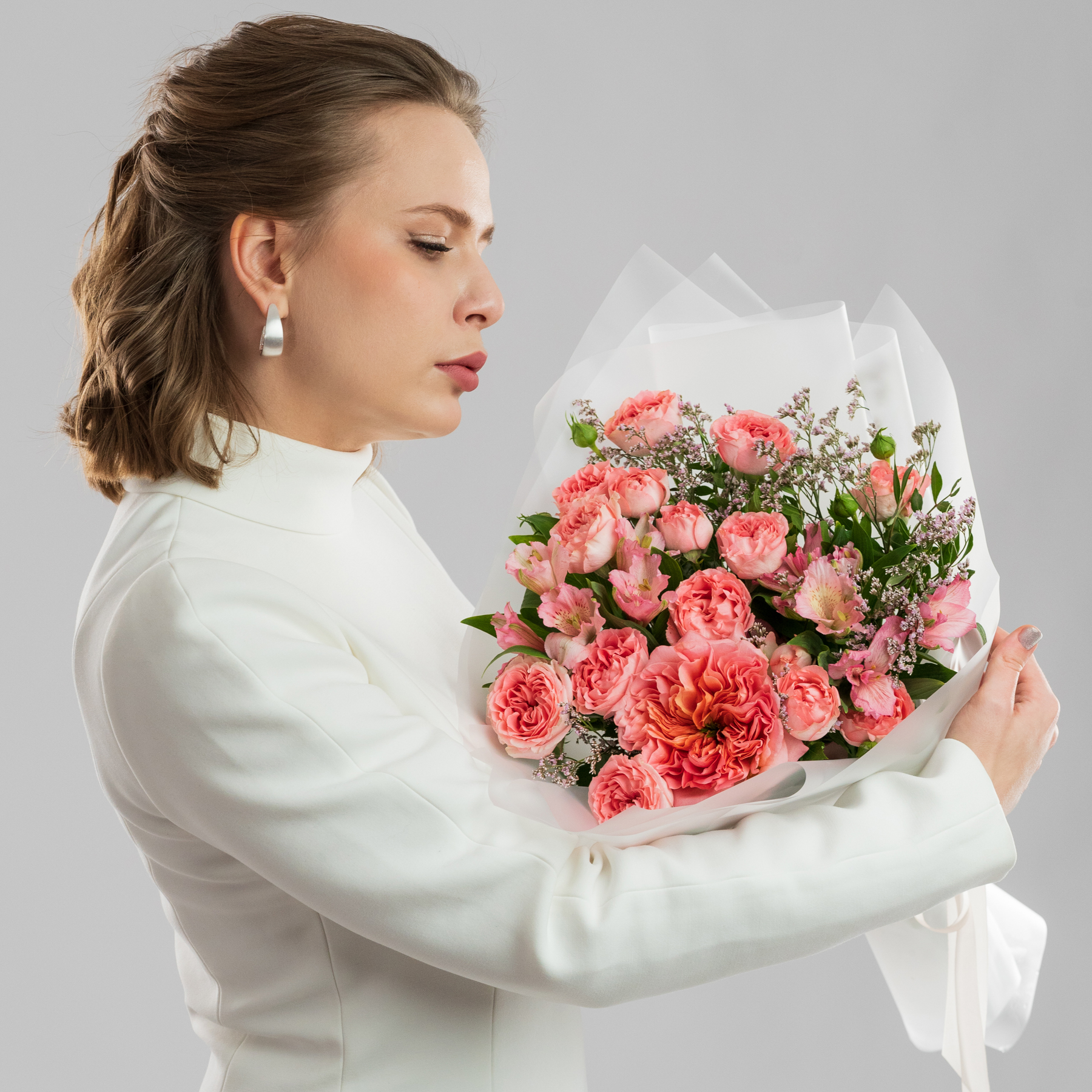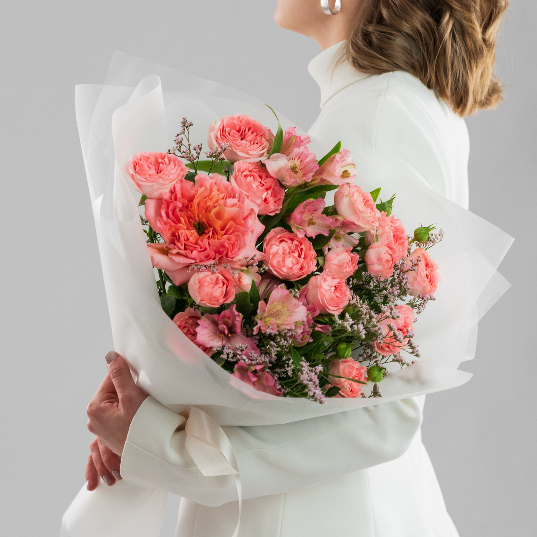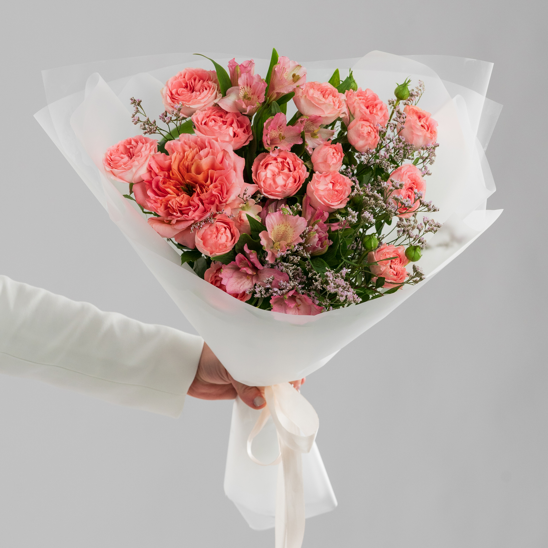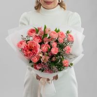Букет "Нежность лепестков" – изысканное сочетание розы Мандарин экспрешн с кустовой розой, дополненное альстромерией и лимониумом. Нежность и романтика, с доставкой!